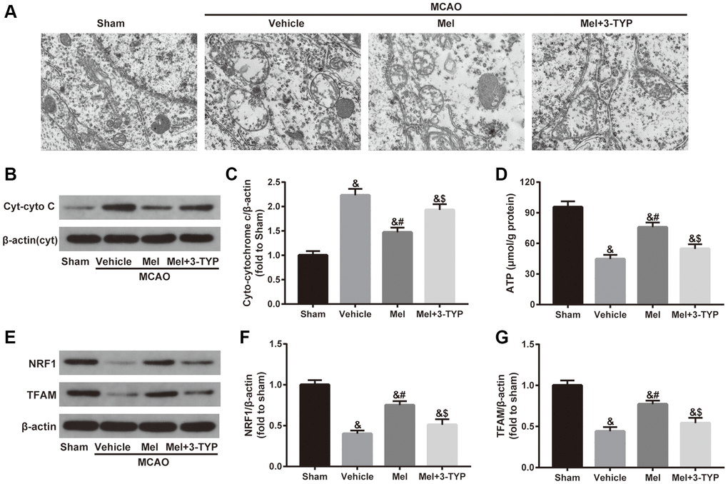 As shown in Figure 3A, mitochondria in the sham group showed normal morphological structure with integrated mitochondrial crest while mitochondria in the vehicle group showed serious vacuolization and swelling. Melatonin significantly improved mitochondrial vacuolization and swelling while the beneficial effects of melatonin were attenuated by 3-TYP. Next, we evaluated the integrity of mitochondria by detecting the expression of cytoplasmic cytochrome C (Cyt-cyto C) (Figure 3B and 3C). Cytochrome C is an important component of the electron transport chain in mitochondria. Once the integrity of mitochondria is impaired, the expression level of Cyt-cyto C would be significantly increased [38]. Our results showed that melatonin treatment significantly reduced CIR-induced upregulation of Cyt-cyto C, suggesting that melatonin exerted beneficial effects in maintaining the integrity of mitochondria but the effects were significantly blunted by 3-TYP. Furthermore, melatonin significantly improved CIR-induced mitochondrial adenosine triphosphate (ATP) deficiency, which was also prominently attenuated by 3-TYP (Figure 3D). Besides, we measured the expression of nuclear respiratory factor 1(NRF1) and mitochondrial transcription factor A (TFAM), two important mitochondrial biogenesis factors. The results showed that melatonin significantly increased their expressions in the Mel group compared with those in the vehicle group. Consistently, 3-TYP largely weakened these effects (Figure 3E–3G).
