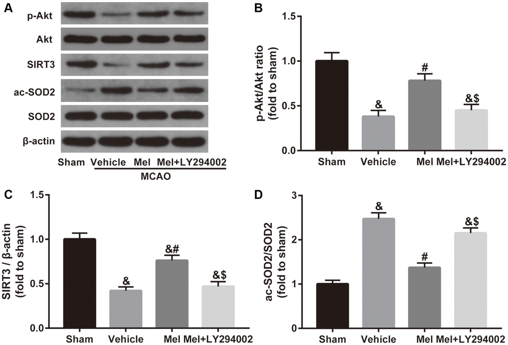 To investigate the mechanism of melatonin-induced SIRT3/SOD2 signaling activation, the Akt signaling was studied further. As shown in Figure 4, CIR induced a reduced phosphorylation level of Akt (p-Akt/Akt ratio), accompanied by decreased SIRT3 expression and increased acetylation of SOD2 (ac-SOD2/SOD2 ratio). In contrast, melatonin treatment significantly increased the phosphorylation of Akt and the expression of SIRT3 and reduced the acetylation of SOD2. Notably, inactivation of the Akt pathway using LY294002 mediated a reduction in the phosphorylation of Akt and also caused a decrease in the SIRT3 expression and induced an elevation of acetylation of SOD2 in the presence of melatonin. Collectively, it suggested that Akt is required for the activation of SIRT3-SOD2 signaling by melatonin in the CIR-injured diabetic brain.