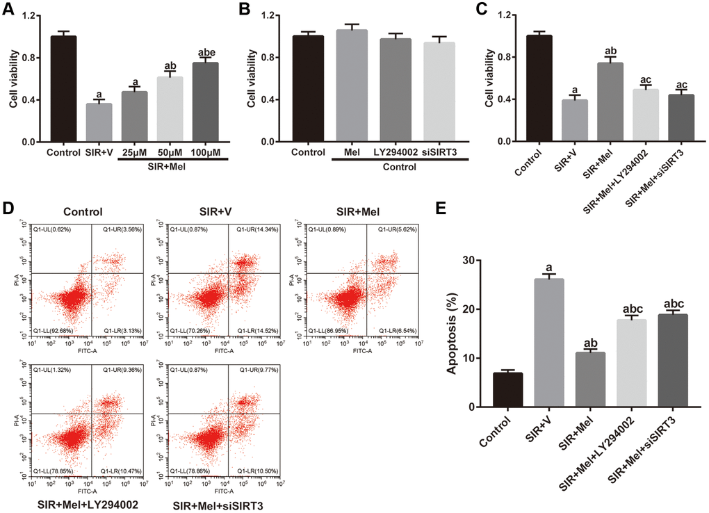 We further performed in vitro studies using murine hippocampal neuron cell line HT22 to investigate whether melatonin directly protects against CIR injury and to illuminate the underlying mechanism. As shown in Figure 5A, SIR-injured HT22 cells were treated with different concentrations of melatonin (25 μM, 50 μM, and 100 μM) and cell viability was then tested. Melatonin notably increased the cell viability of SIR-injured HT22 cells in a dose-dependent manner. The cytoprotective effect of melatonin was most obvious at 100 μM and 100 μM was then selected for further mechanistic investigations. Furthermore, the effects of melatonin, LY294002 and siSIRT3 treatments were evaluated in control cells. As shown in Figure 5B, melatonin, LY294002, and siSIRT3 treatments had no significant effects on the cell viability of high glucose-treated control HT22 cells, respectively. However, LY294002 or siSIRT3 treatment significantly reduced melatonin-mediated increase of cell viability in high glucose-treated HT22 cells following SIR injury (Figure 5C). Additionally, the apoptosis level was markedly reduced by melatonin pretreatment compared with that in the SIR+V group. Nevertheless, the anti-apoptosis effects mediated by melatonin observed in the SIR + Mel group were markedly attenuated by either LY294002 or siSIRT3 (Figure 5D and 5E). These results provided evidence that Akt signaling and SIRT3/SOD2 signaling are key mediators of the cytoprotective actions of melatonin.