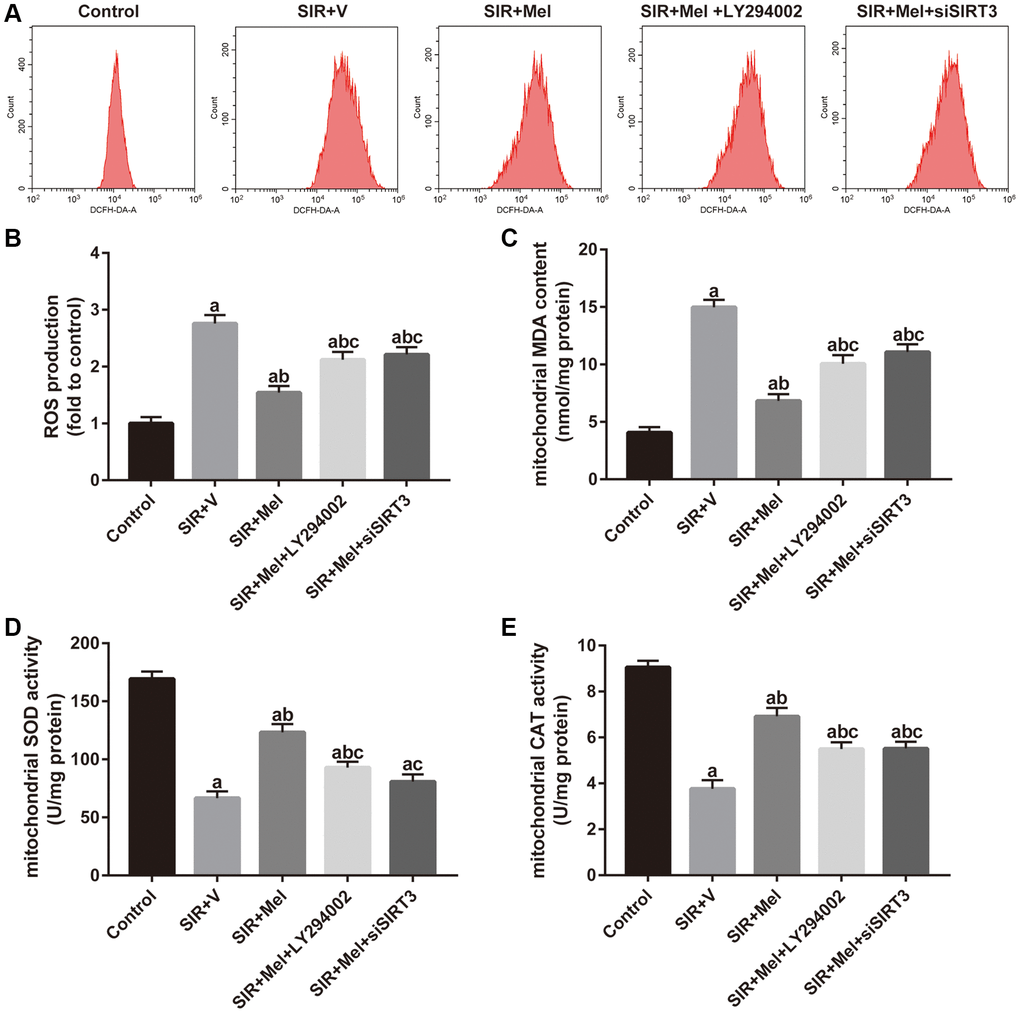 As shown in Figure 6A and 6B, melatonin markedly decreased intracellular ROS production and the alleviative effect was largely weakened by either LY294002 or siSIRT3. Simultaneously, mitochondrial MDA generation significantly decreased in the melatonin-treated group, accompanied by increased activity of SOD and CAT. However, the mitigatory effects were also blunted by LY294002 or siSIRT3 (Figure 6C–6E). These data showed that melatonin could attenuate mitochondrial oxidative damage against SIR injury via Akt and SIRT3/SOD2 signaling in high glucose-treated HT22 cells.