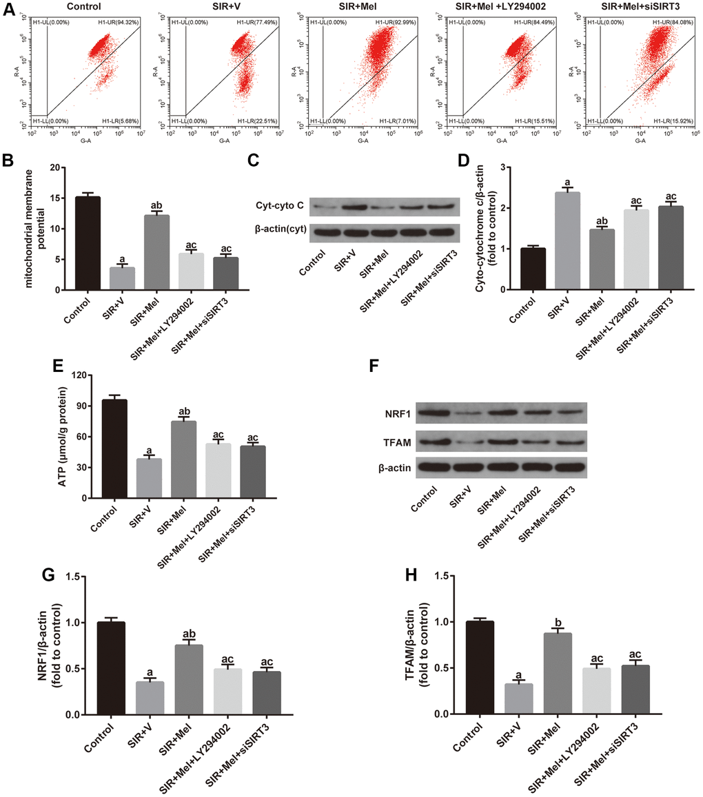 To further confirm the beneficial role of melatonin, we measured mitochondrial membrane potential (MMP), an important parameter of the mitochondrial function used as an indicator of ATP synthesis [39], and mitochondrial ATP content in our in vitro study. As shown in Figure 7A, 7B and 7E, melatonin treatment significantly ameliorated SIR induced-reduction of MMP and ATP levels and these effects were largely reversed by either LY294002 or siSIRT3. Additionally, western blot analysis showed that expression of Cyt-cyto C was noticeably reduced while the expression of NRF1 and TFAM was increased in the melatonin-treated group. However, LY294002 or siSIRT3 also blunted these effects (Figure 7C, 7D and 7F–7H). These data suggested that melatonin could alleviate the impairments in mitochondrial function and biogenesis in high glucose-treated HT22 cells. Importantly, Akt and SIRT3/SOD2 signaling mediated this action.