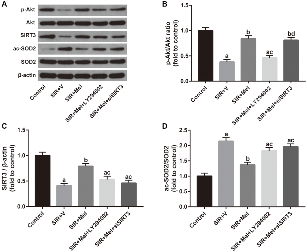Melatonin, streptozotocin (STZ), and 2,3,5-triphenyl tetrazolium chloride (TTC) were obtained from Sigma-Aldrich (St. Louis, MO, USA). LY294002 and 3-TYP were purchased from MedChemExpress (MCE; Monmouth Junction, NJ, USA). Dulbecco’s Modified Eagle Medium (DMEM) and penicillin/streptomycin were obtained from GENOM (Hangzhou, China), fetal bovine serum (FBS) were bought from TIANHANG (Zhejiang, China). The mitochondrial membrane potential assay kit with JC-1 and the ROS Assay Kit were got from Beyotime (Shanghai, China). Cell Counting Kit-8 (CCK-8) was obtained from Absin (Shanghai, China). Kits for detecting malondialdehyde (MDA) content, superoxide dismutase (SOD) activity, catalase (CAT) activity, and ATP content and Mitochondria Isolation Kit were purchased from the Nanjing Jiancheng (Nanjing, Jiangsu, China). The Annexin V-FITC Apoptosis Detection Kit was obtained from KeyGEN (Nanjing, Jiangsu, China). Primary antibodies against p-Akt, Akt, cytochrome c (cyto-C), and β-actin, as well as the secondary antibodies, were all purchased from Cell Signaling Technology (CST; Boston, MA, USA). Primary antibodies against SIRT3, SOD2 (acetyl K68) (ac-SOD2), SOD2, TFAM, TFAM were purchased from Abcam (Cambridge, MA, USA).