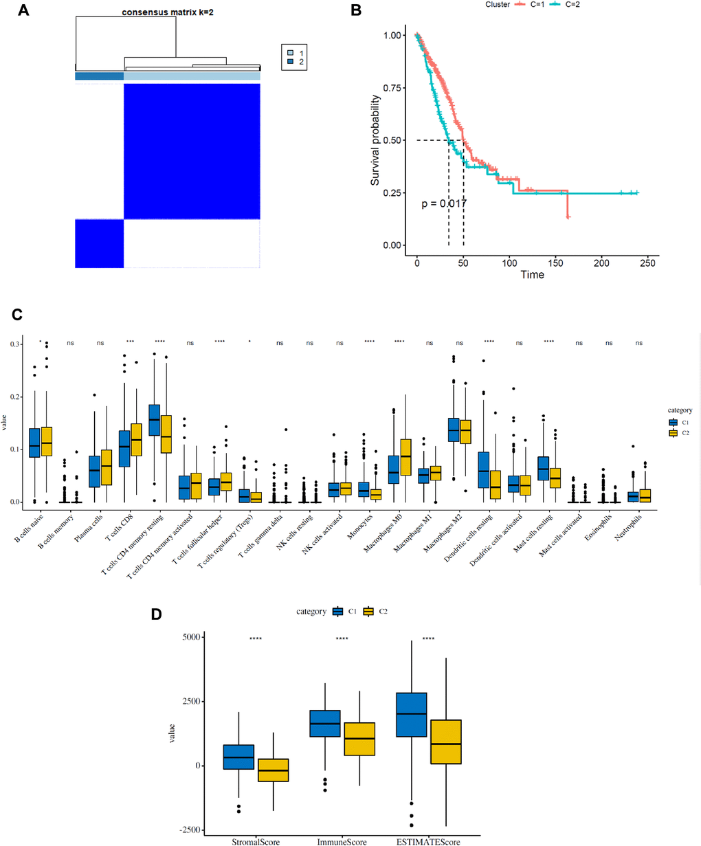 The immunoscore of each patient was calculated with the ESTIMATE algorithm in the R “estimate package.” The fraction of twenty-two immune cell types for each contained sample was yielded through cell type identification by estimating relative subsets of RNA transcripts (CIBERSORT; https://cibersortx.stanford.edu/). An algorithm with 1,000 permutations was adopted. Only samples with a CIBERSORT p < 0.05 were included for subsequent analysis of the differential immune infiltration levels among the subgroups grouped by clustering subtypes and risk scores.