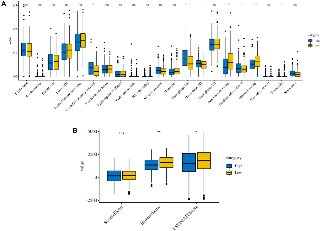 To estimate the effects of the 5 FRG-based signatures on the LUAD immune microenvironment, the relationship between the risk score and the infiltration of different immune cell types was further explored. Subsequently, the fraction of 21 immune cell types were analyzed and compared between the high-risk and low-risk groups (Figure 5A). We found that four kinds of immune cells showed higher infiltration levels in the high-risk group, including CD4 memory-activated T cells, M0 macrophages, M1 macrophages and activated dendritic cells, and three kinds of immune cells showed higher infiltration levels in the low-risk group, including resting mast cells, activated mast cells and eosinophils. Then, based on the ESTIMATE algorithm, we calculated the immune and stromal scores. The results showed that the high-risk group had higher immune and stromal scores than those of the low-risk group (Figure 5B). These results confirmed that FRG-based risk signatures were implicated in the LUAD immune microenvironment.