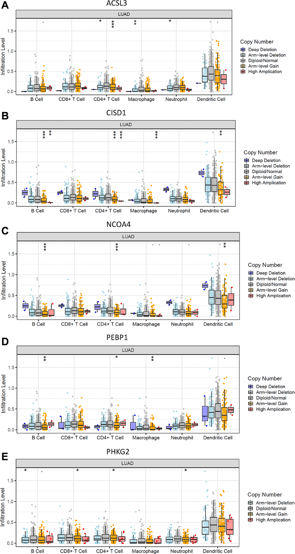 To elucidate the underlying mechanisms by which the risk score was related to different immune cell infiltrations, the effects of somatic cell copy number alterations (CNAs) of the five FRG-based signatures on immune cell infiltration were further analyzed. We observed that the infiltration levels of B cells, CD8+ T cells, CD4+ T cells, macrophages, neutrophils and dendritic cells in the TME in LUAD patients were obviously influenced by arm-level deletion and arm-level gain of the five identified FRGs-based signature, which further demonstrated that the five FRGs played an important role in the regulation of the TME in LUAD patients (Figure 6).
