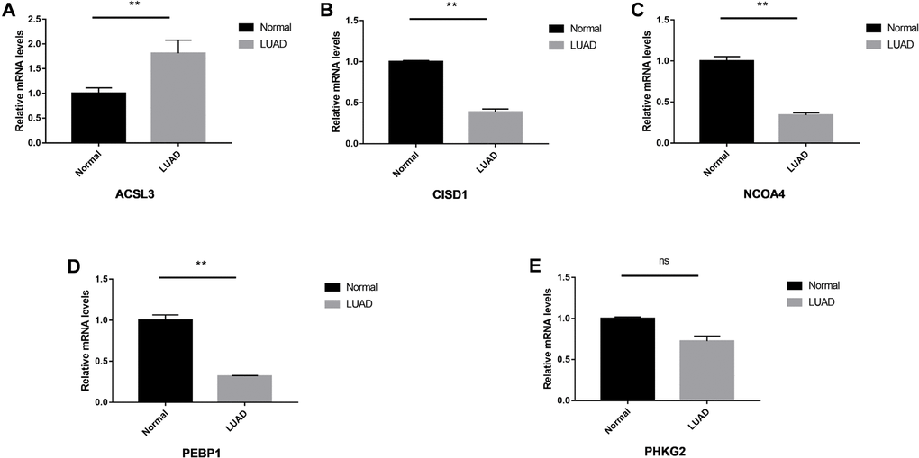 We performed the validation in clinical specimens following the steps described in the Method. We verified the five FRGs (PEBP1, ACSL3, NCOA4, PHKG2, CISD1) which constructed the survival model of LUAD patients. As the PCR results showed ACSL3 was up-regulated and the PEBP1, CISD1 and NCOA4 were significantly down-regulated in the LUAD tissues. There was no statistical significance in the expression of PHKG2 between the normal and LUAD specimens. The details of the five genes were visualized in Figure 7A–7E.