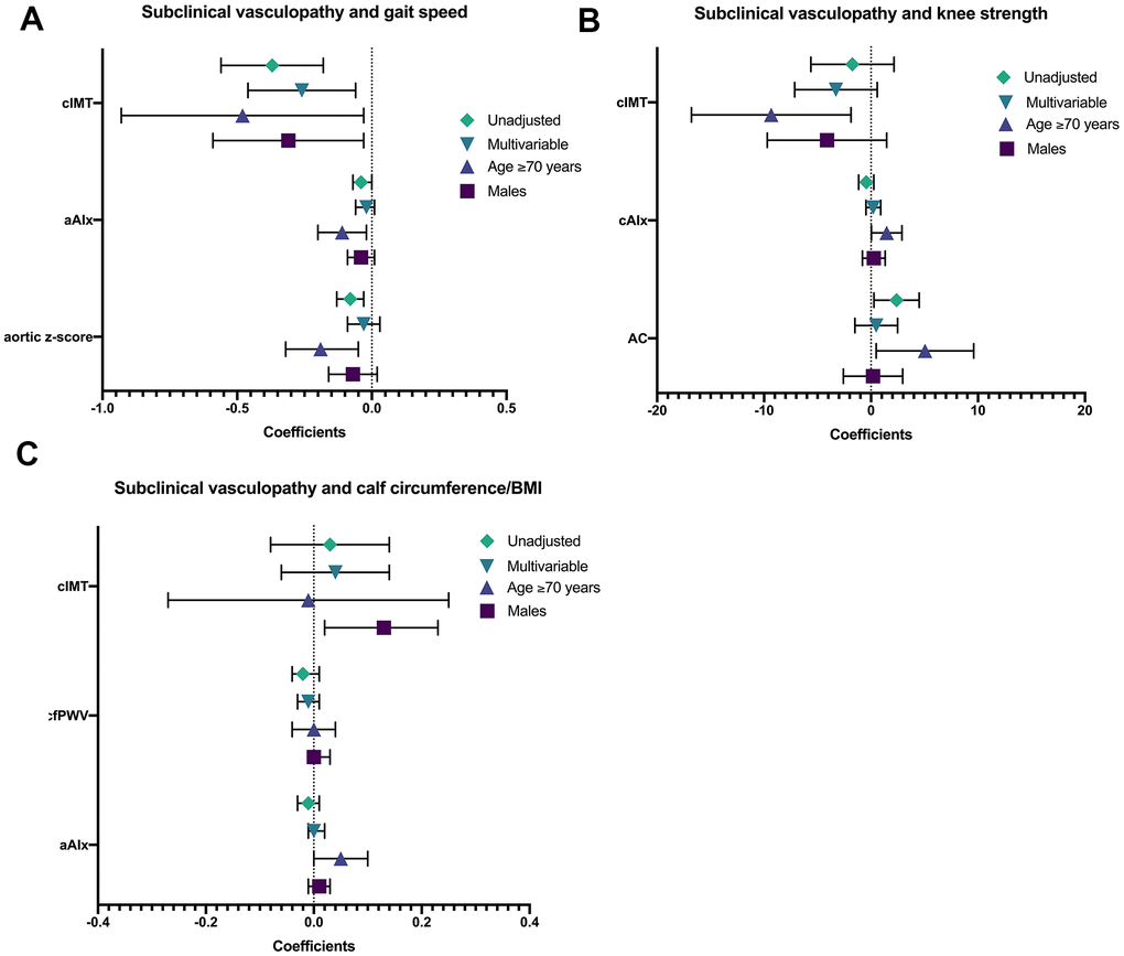 The strength and significance of the associations were attenuated after adjustment for demographics and cardiometabolic risk factors. cIMT remained inversely associated with gait speed (Figure 1). None of the markers of subclinical vasculopathy were independently related to knee strength and calf circumference/BMI.