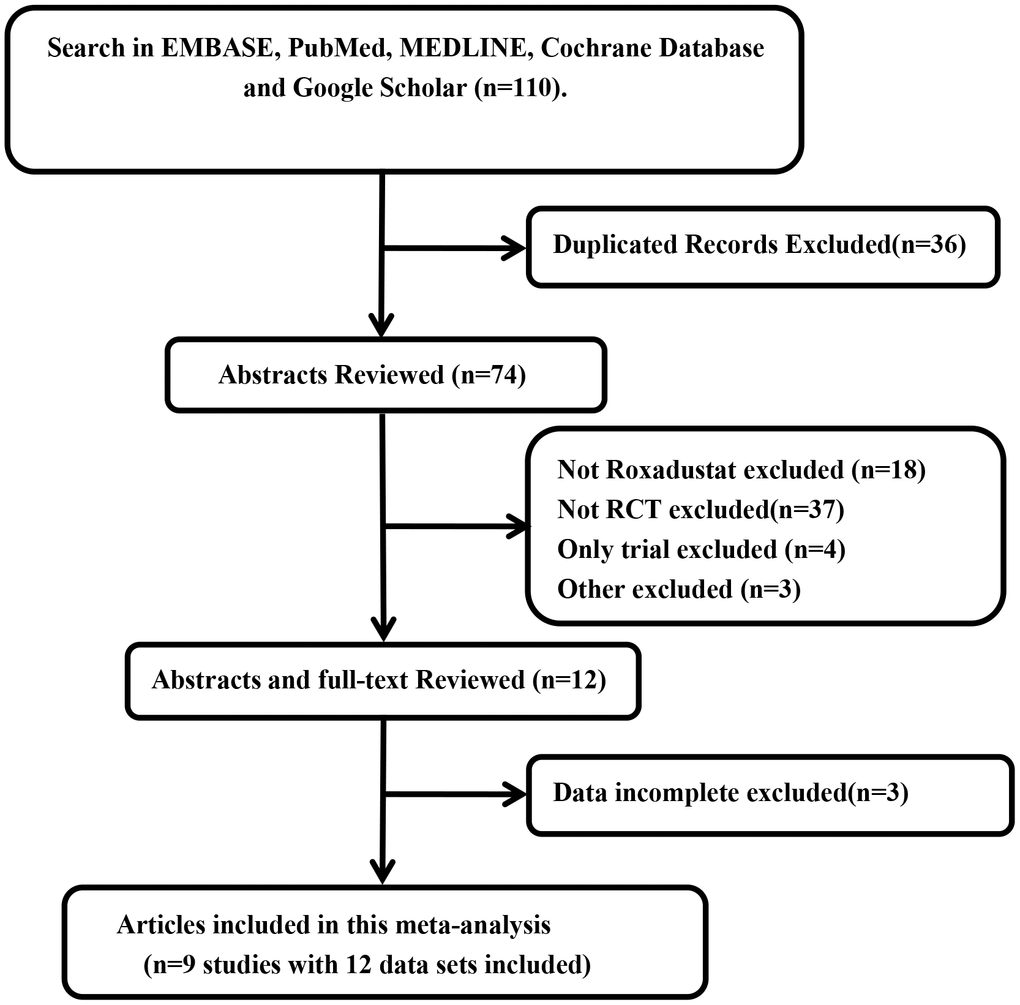 We identified 110 articles by searching EMBASE, PubMed, MEDLINE, Cochrane Database, and Google Scholar without any limitations on language. One hundred and one of these articles were either duplicated, did not include roxadustat, were not randomized controlled trials (RCTs), were only clinical trials, or contained incomplete data and were therefore excluded. Finally, nine articles [12–20] that included 12 data sets and 11 RCTs (Figure 1) were used to perform the meta-analysis.