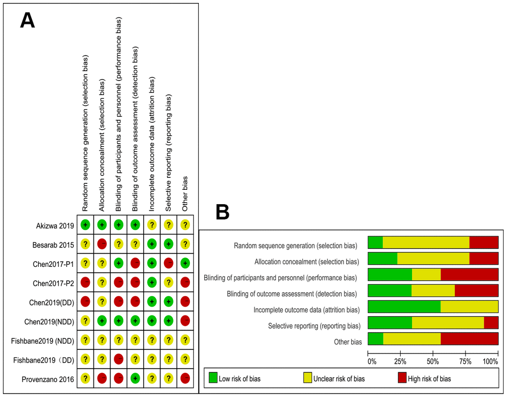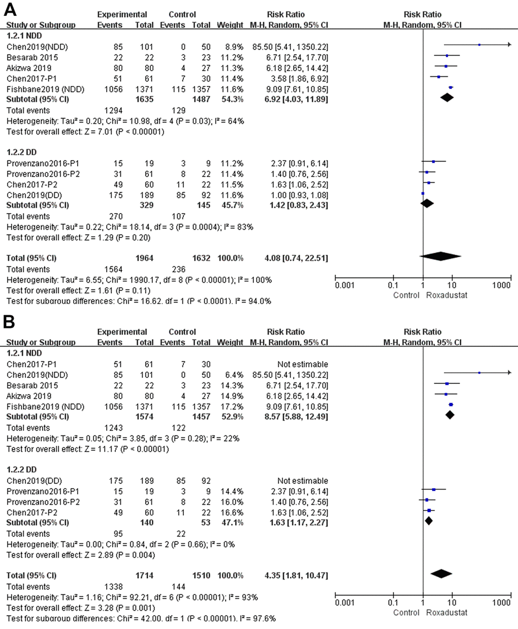 We performed a sensitivity analysis as shown in Figure 4B. After Chen 2017 P1 and Chen 2019 (DD) were excluded from the NDD and DD subgroups, one by one, the Hb response rate of the roxadustat group was significantly higher than in the control group, without significant heterogeneity.