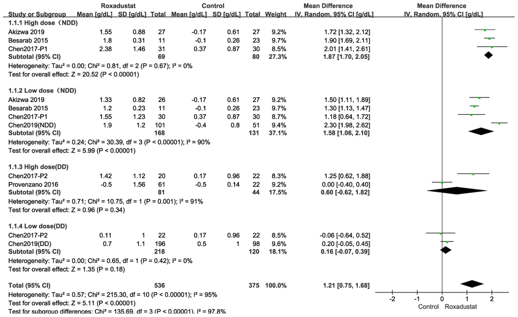 Because the meta-analysis could be affected by the roxadustat dosage in the six articles [12–17] and whether the patients got dialysis, we performed four subgroup analyses depending on whether the patient received a high/low dose of roxadustat or whether the patient had NDD/DD-CKD (Figure 3). In the high-dose NDD subgroup, there was no significant heterogeneity, and the Hb change was significantly higher in the roxadustat group than in the placebo group (P<0.0001, mean difference [MD]=1.87 [95% confidence interval (CI): 1.70, 2.05], Figure 3A). In the low-dose NDD subgroup, there was significant heterogeneity (I2=98%), and the Hb level change was significantly higher in the roxadustat group (P=0.001, MD=1.29 [95% CI: 0.50, 2.09], Figure 3B). There was no significant difference in the Hb level changes between the roxadustat and the ESA groups among the high- and low-dose DD-CKD subgroups (Figure 3C, 3D).