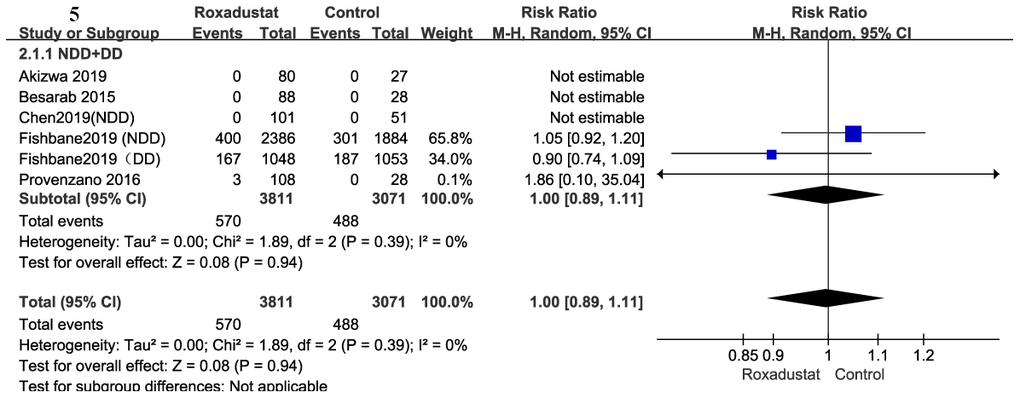 A total of 6882 participants were included to determine mortality in the six trials [14, 15, 17, 18, 20, 21] in this meta-analysis. Compared to the placebo/ESA groups, there was no significant difference in the mortality of the roxadustat group (P=0.94), and there was no significant heterogeneity (Figure 5).