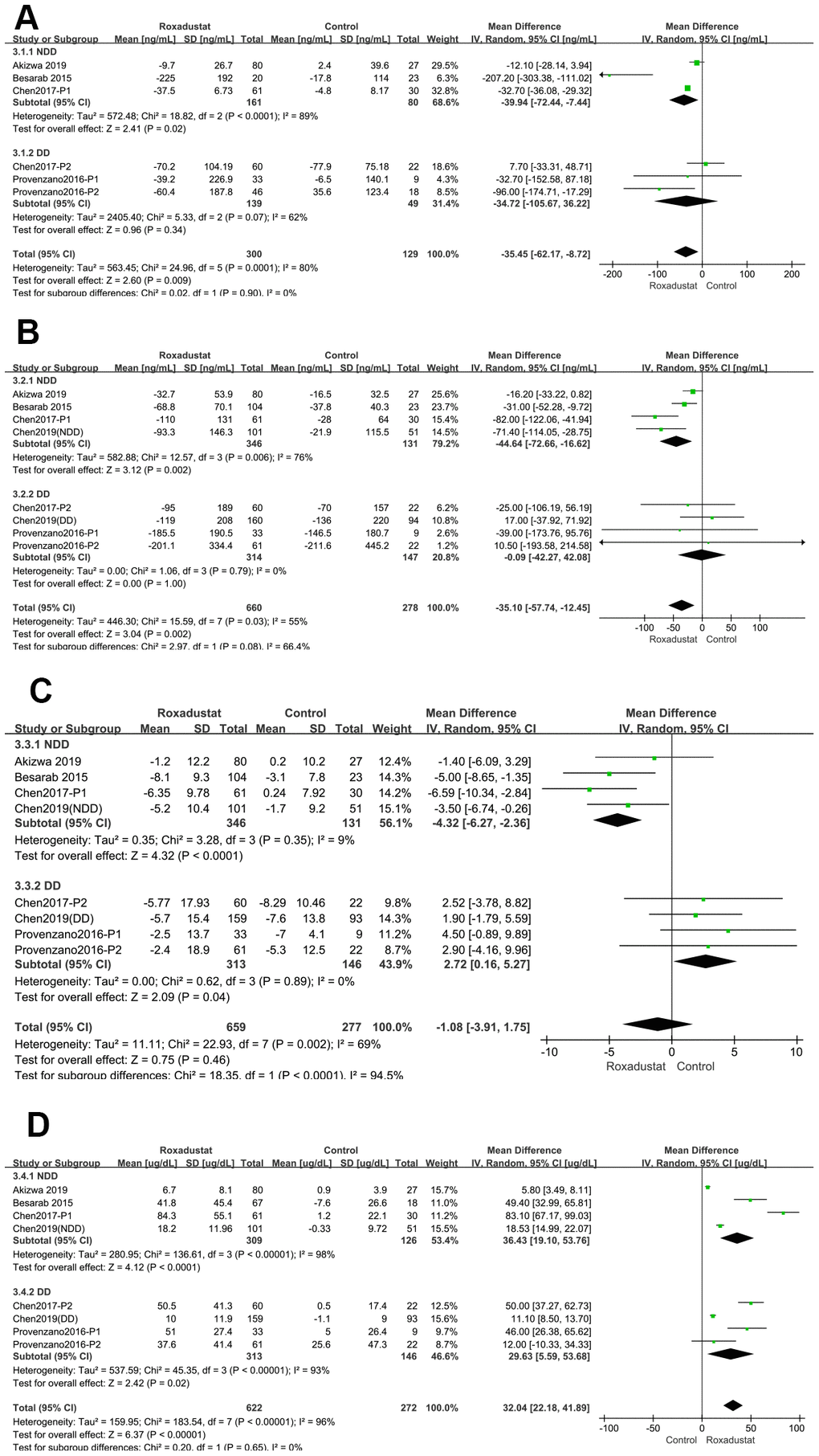 ΔTSAT% was compared in NDD-CKD patients from four clinical trials [14, 16–18]. The ΔTSAT% of the roxadustat group was significantly lower than that of the placebo/ESA group (P<0.0001, MD = -4.32, 95% CI: -6.27, -2.36) with no significant heterogeneity. A similar result was observed in the DD-CKD subgroup [15, 16, 19] (P=0.04, MD=2.27, 95% CI: 0.16, 5.27); however, the ΔTSAT% of the roxadustat group was significantly lower than that of the placebo/ESA group (Figure 6C).