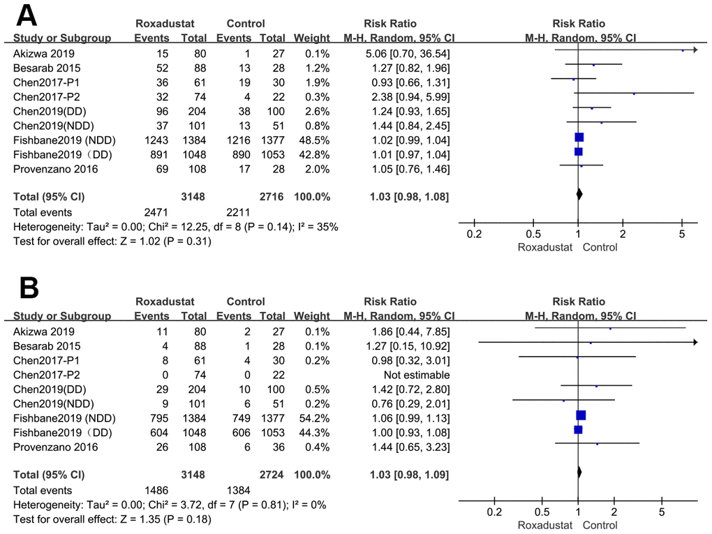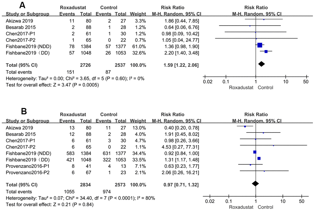 The rate of withdrawal from the study because of AEs was significantly higher in the roxadustat group than in the control group (P=0.0005, RR=1.59, 95% CI: 1.40, 2.06), without any significant heterogeneity (Figure 9A). However, there was no significant difference in the rate of the discontinuation of treatment by any cause between the two groups (Figure 9B).