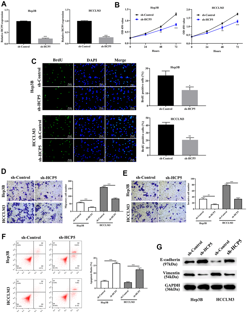 Investigation on the specific function of HCP5 in HCC was performed by transfecting sh-HCP5 into Hep3B and HCCLM3 cell lines to knockdown HCP5. As depicted in Figure 2A, HCP5 was significantly lower expressed in HCC cell lines (Hep3B and HCCLM3) that underwent sh-HCP5 transfection. Subsequently, the cell proliferative capacity was attenuated in Hep3B and HCCLM3 cell with HCP knockdown using the CCK-8 assay (**p<0.01, ***P<0.001, Figure 2B) and BrdU assay (*p<0.05, **P<0.01, Figure 2C). Moreover, metastatic and invasive abilities in HCC cells were investigated by transwell chamber assay. The results demonstrated that HCP5 knockdown in Hep3B and HCCLM3 cells resulted in alleviating the cell metastatic and invasive quantities (**p<0.01, ***P<0.001, Figure 2D, 2E), which indicated that the presence of HCP5 could functionally augment the metastatic and invasive abilities in HCC.
