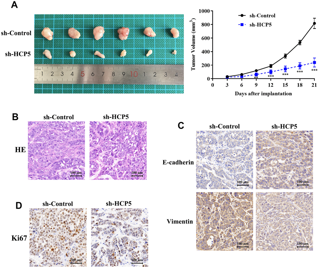 Although we have found evidence that HCP5 could promote HCC proliferation, metastasis and invasion in vitro, the in vivo effect of HCP5 on HCC progression still needs to be elucidated. Consequently, we injected HCCLM3 cells into nude mice to establish an HCC animal model. The tumor volume was recorded every 3 days after establishing the xenograft. The tumor volume of the sh-HCP5 transfected group was lower than that of the control group (Figure 3A), which further indicated that down-regulation of HCP5 could slow down HCC progression. Next, tumors were excised from nude mice and sectioned. HE-staining was used to evaluate the differences between controls and mice with down-regulated levels of HCP5. Consistent with the in vitro findings, knockdown of HCP5 destroyed the HCC tumor tissues (Figure 3B). Additionally, the metastasis phenotype was also examined and the results shown in Figure 3C suggested that knockdown of HCP5 led to higher E-cadherin expression and lower vimentin expression when compared with the sh-NC transfected group (Figure 3C). Moreover, Ki67 was utilized to estimate the HCC proliferation in vivo. Consistent with our hypothesis, down-regulation of HCP5 significantly reduced the number of cells that were positive for Ki67 staining (Figure 3D), which demonstrated that HCP5 is a pivotal factor in HCC progression.