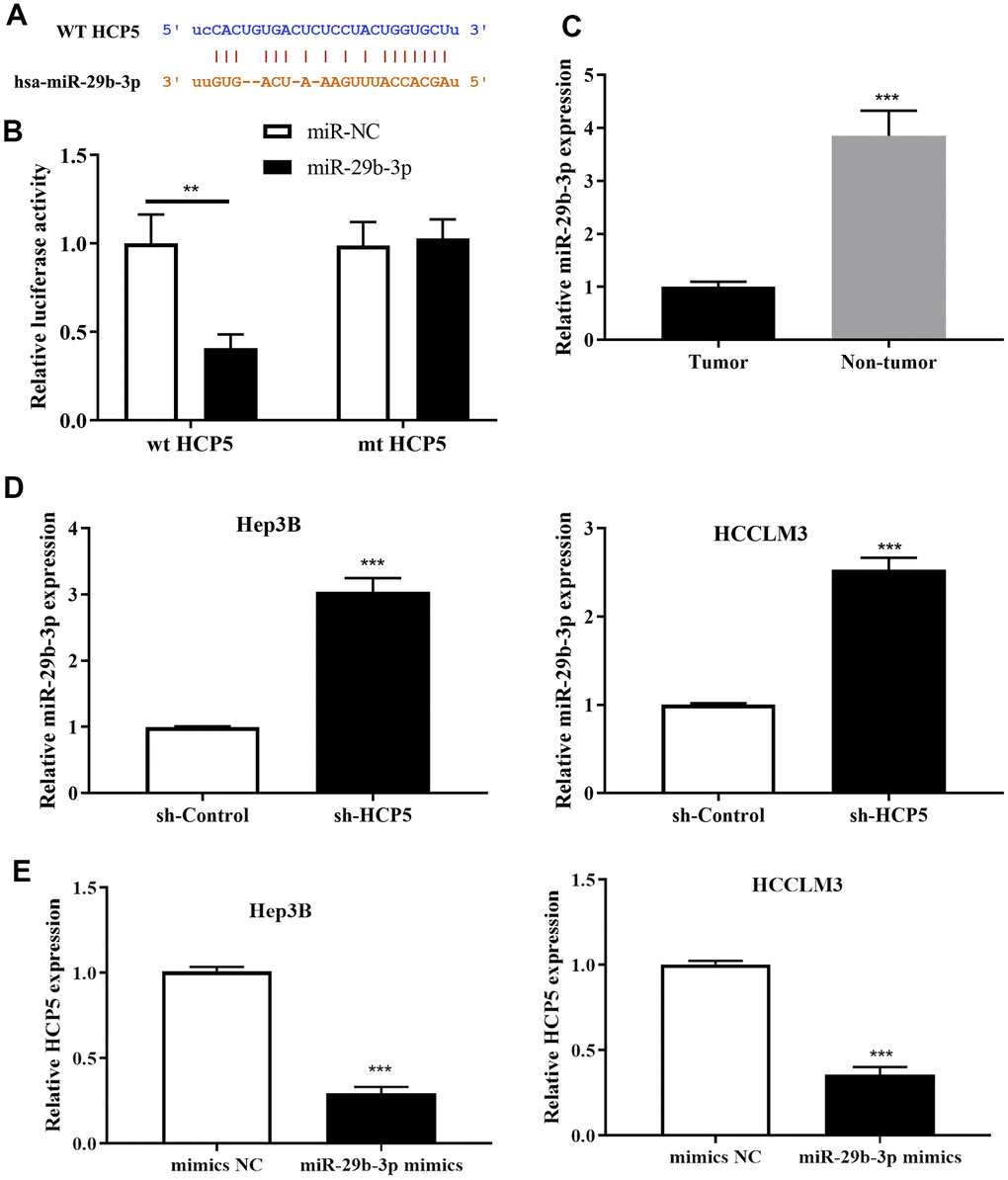 To further explore the downstream molecular regulatory mechanism of HCP5, we employed StarBase v3.0, miRanda and LncBase to identify a potential target gene of HCP5. The intersection of prediction targets of the three databases showed that there was a covalent binding fragment of HCP5 wild type binding sites on the miR-29b-3p gene sequence (Figure 4A), which encouraged us to further investigate the exact correlation between miR-29b-3p and HCP5 in HCC. The dual luciferase assay demonstrated a significant reduction in luciferase activity between wt-HCP5 and miR-29b-3p, which indicated that miR-29b-3p can be directly bound to HCP5 in HCC (**p<0.01, Figure 4B). The expression level of miR-29b-3p in HCC tissues and adjacent normal tissues was also determined. As expected, miR-29b-3p was expressed in low quantities in HCC tissues when compared to normal tissues (**p<0.001, Figure 4C, U6 served as the internal control), from which we speculated that miR-29b-3p might serve as a tumor suppressor in HCC. Also, the expression level between miR-29b-3p and HCP5 was analyzed through qRT-PCR and the results showed that miR-29b-3p and HCP5 were negatively correlated (Figure 4D, 4E). The results presented in Figure 4D show that knockdown of HCP5 increases miR-29b-3p expression (***p<0.001). While treated with miR-29b-3p mimics, HCP5 was found to be down-regulated (p<0.05, Figure 4E), which suggested that miR-29b-3p and HCP5 were in a negative feedback regulation cycle.
