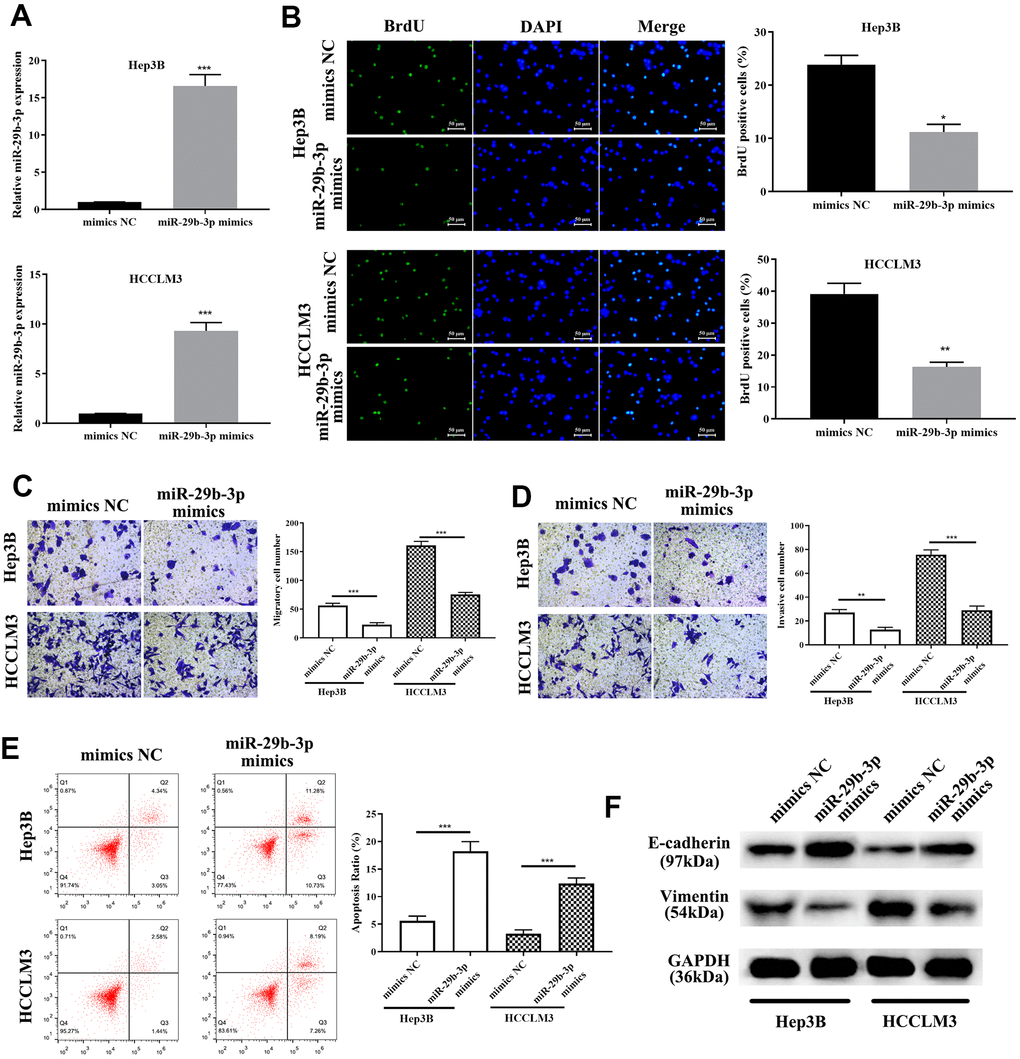 To explore the exact role of miR-29b-3p in HCC, miR-29b-3p mimics and mimics NC were used to treat HCC cells (HCCLM3 and Hep3B). QRT-PCR was conducted to evaluate the miR-29b-3p expression level after treatment of the above-mentioned reagents. MiR-29b-3p was highly expressed after treatment of HCC cells with miR-29b-3p mimics compared to the mimics NC group (***p<0.001, Figure 5A). BrdU assay demonstrated that highly expressed miR-29b-3p resulted in a lower proliferative rate (*p<0.05, **p<0.01 compared to mimics NC, Figure 5B), which directly illustrated that miR-29b-3p has the ability to prevent HCC cell proliferation. Additionally, the cell metastatic and invasive capacity were alleviated when HCC cell lines (HCCLM3 and Hep3B) were treated with miR-29b-3p mimics (**p<0.01, ***p<0.001, Figure 5C, 5D). Thus, these results collectively showed that miR-29b-3p can inhibit HCC cell proliferation, metastasis and invasion, thereby preventing the exacerbation of HCC. Next, flow cytometry was conducted to examine the effect of miR-29b-3p on cell apoptosis. Our data demonstrated that the apoptosis rate was higher in the miR-29b-3p mimics group (***p<0.001 compared with mimics NC, Figure 5E), which suggested that miR-29b-3p prevented cell growth through improving cell apoptosis. Furthermore, Western blot analysis demonstrated that high levels of miR-29b-3p led to up-regulation of E-cadherin and down-regulation of vimentin (Figure 5F).