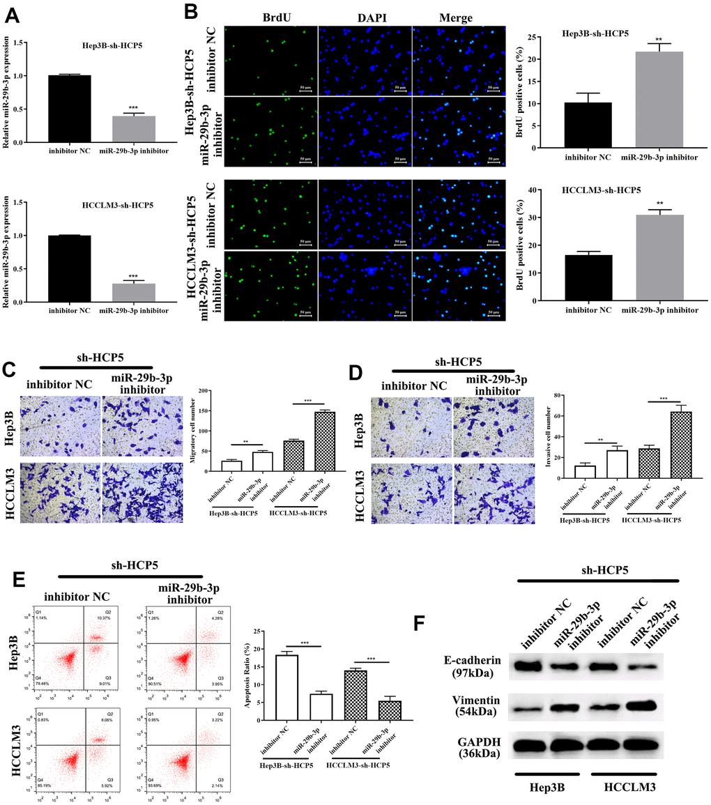 To investigate the correlation between miR-29b-3p and HCP5, miR-29b-3p inhibitor was given to sh-HCP5-transfected HCCLM3 cells. QRT-PCR showed that knockdown of HCP5 resulted in higher levels of miR-29b-3p, while, when treated with an miR-29b-3p inhibitor, the expression of miR-29b-3p decreased (***p<0.001, Figure 6A). In addition, the proliferation of miR-29b-3p inhibitor-treated HCCLM3 cells transfected with sh-HCP5 was determined using BrdU assay, and the result showed that when treated with an miR-29b-3p inhibitor, the proliferative rate significantly increased (**p<0.01, Figure 6B), which indicated that miR-29b-3p was a tumor suppressor of HCC. Moreover, the transwell assay demonstrated that the miR-29b-3p inhibitor further promoted the metastatic and invasive capacity attenuated by sh-HCP5 (**p<0.01, ***p<0.001, Figure 6C, 6D). Further studies of the mechanism were investigated through flow cytometry and Western blot analysis. The data showed that an miR-29b-3p inhibitor prevented cell apoptosis (***p<0.001, Figure 6E), which indicated that an miR-29b-3p inhibitor promoted cell growth through preventing apoptosis. Western blot analysis was conducted to determine the expression of EMT-correlated proteins (E-cadherin and vimentin), the results showed that when treated with an miR-29b-3p inhibitor, the expression of vimentin was increased while that of E-cadherin was decreased (Figure 6F). These data collectively showed that miR-29b-3p blocked cell growth, metastatic and invasive capacity via promoting apoptosis, up-regulating E-cadherin and down-regulated Vimentin.