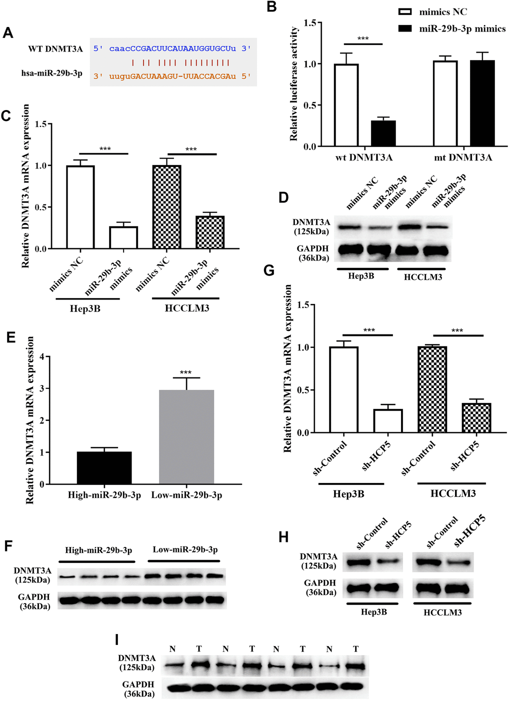 For further exploration of the mechanism by which miR-29b-3p modulates the progression of HCC, Targetscan, miRanda, and miRWalk databases were used to identify direct target genes of miR-29b-3p. Subsequently, DNMT3A was found as the downstream target of miR-29b-3p. As shown in Figure 7A, the bioinformatics prediction demonstrated that DNMT3A was indeed a potential target gene of miR-29b-3p. IN addition, the dual luciferase assay further showed that there was a direct interaction between miR-29b-3p and DNMT3A (***p<0.001, Figure 7B). Western blot and qRT-PCR analysis exerted that expression level of DNMT3A was reduced when treated miR-29b-3p mimics. The results showed that high levels of miR-29b-3p inhibited the expression of DNMT3A (***p<0.001, Figure 7C, 7D). Moreover, qRT-PCR and Western blot results demonstrated that tissues with down-regulated miR-29b-3p had higher expression levels of DNMT3A. High expression of miR-29b-3p resulted in lower expression of DNMT3A, which indirectly elucidated that the expression of DNMT3A was inverse correlated to miR-29b-3p. (Figure 7E, 7F). Furthermore, qRT-PCR and Western blot analysis showed that knockdown of HCP5 resulted in lower expression levels of DNMT3A at mRNA and protein levels when compared with sh-control both in Hep3B and HCCLM3 cells (Figure 7G, 7H). Next, expression levels of DNMT3A in HCC tissues were determined through Western blot analysis, and the data demonstrated that DNMT3A was up regulated in HCC tissues when compared to adjacent normal tissues (Figure 7I). The results mentioned above collectively illustrated that DNMT3A is a crucial participating factor in modulating HCC progression.