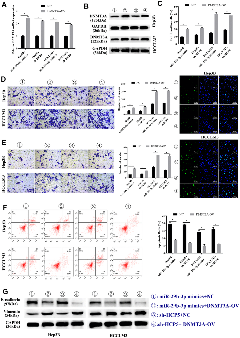 Previous studies have shown that DNMT3A played a role in HCC, therefore, we proposed that up-regulation of DNMT3A might alter the HCC progression inhibited by miR-29b-3p. Consequently, DNMT3A-OV and NC were transfected into HCC cell lines (HCCLM3 and Hep3B) to up-regulate the expression of DNMT3A. In addition, miR-29b-3p mimics and sh-HCP5 transfection were used to determine the correlation of miR-29b-3p, HCP5, and DNMT3A. As shown in Figure 8A, qRT-PCR demonstrated that the DNMT3A expression decreased when miR-29b-3p was overexpressed, when co-given overexpression plasmid of DNMT3A, the expression level significantly increased both in Hep3B and HCCLM3 cell lines (*p<0.05). Furthermore, in Hep3B and HCCLM3 cells, knockdown of HCP5 by sh-HCP5 presented decreased level of DNMT3A when merely transfected with NC, while the expression level increased when given DNMT3A up-regulation plasmid transfection (*p<0.05). Consistent with these results, western blot analysis showed that the expression of DNMT3A was down-regulated in miR-29b-3p overexpression or HCP5 knockdown cells, and was up-regulated when transfected with a DNMT3A overexpression plasmid (Figure 8B). Subsequently, the BrdU assay was used to determine the effect of DNMT3A on HCC proliferation, and the results showed that overexpression of DNMT3A led to increased cell growth (*p<0.05, Figure 8C). Next, the cell metastatic and invasive ability were examined through the transwell chamber assay, and the data suggested that both the metastatic and invasive capacity were inhibited, both in Hep3B and HCCLM3 cells, when transfected NC in the miR-29b-3p overexpression group and HCP5 knockdown group, while the migration and invasion significantly improved when cells were transfected with an up-regulation plasmid of DNMT3A with overexpression of miR-29b-3p or down-regulation of HCP5 (*p<0.05, Figure 8D, 8E). Further exploration of the effect of DNMT3A on regulating proliferation, invasion and migration was performed by flow cytometry and examination of the expression level of EMT-correlated proteins (E-cadherin and vimentin). Flow cytometry showed that DNMT3A promoted cell growth through prohibiting cell apoptosis (*p<0.05, Figure 8F). Simultaneously, Western blot analysis showed that high regulation of DNMT3A could up-regulate vimentin and decrease the expression of E-cadherin (Figure 8G), which suggested that DNMT3A enhanced cell migration and invasion via stimulating the EMT process. These data demonstrated that the proliferation, metastatic and invasive capacity of HCC was augmented when DNMT3A was highly expressed, the mechanism of which involved the prevention of apoptosis and acceleration of the EMT process.