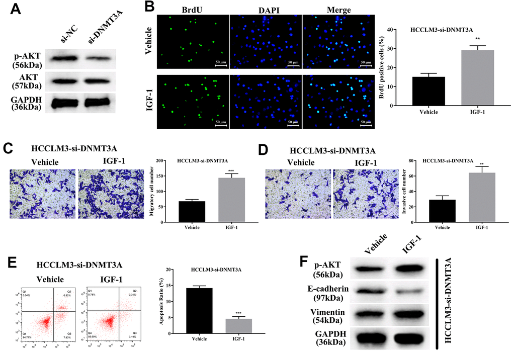 Current studies have shown that DNMT3A can methylate the promoter region of the PTEN gene, thereby resulting in inhibition of transcription of the PTEN gene and decreased expression of PTEN protein, finally elevating the phosphorylation level of AKT [27]. Thus, DNMT3A plays a pivotal role in modulating tumorigenesis through activating the PI3K/AKT pathway in liver cancer and lung cancer [27, 32]. To identify the modulatory function of AKT phosphorylation in HCP5/miR-29b-3p/DNMT3A, we first confirmed that knockdown of DNMT3A significantly decreased AKT phosphorylation by Western blot analysis (Figure 9A). Our data showed that the phosphorylation level of AKT was proportional to DNMT3A. Next, IGF-1, an AKT activator was used to treat HCC cell lines with si-DNMT3A transfection, cell proliferation was determined through BrdU assay and the results demonstrated that activation of AKT enhanced cell growth that was weakened by si-DNMT3A (**p<0.01, Figure 9B). A transwell chamber assay was used to determine the effect of AKT on regulating the HCC metastatic and invasive capacity. The data demonstrated that AKT activation augmented the metastatic and invasive capacity of HCC cells that were attenuated by si-DNMT3A (***p<0.001, **p<0.01, Figure 9C, 9D). Further investigation showed that activation of AKT phosphorylation led to a reduction in cell apoptosis that strengthened the EMT process that was impaired by si-DNMT3A (***p<0.001, Figure 9E, 9F), which proved that the HCP5/miR-29b-3p/DNMT3A axis played a role in AKT phosphorylation in regulating HCC progression.
