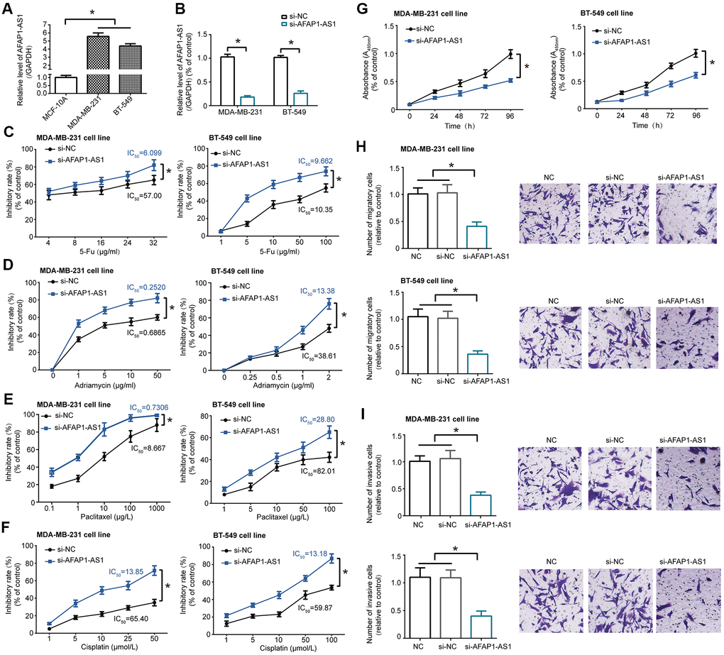 LncRNA AFAP1-AS1 expression in TNBC cell lines (i.e. MDA-MB-231 and BT-549) was obviously heightened as compared with normal breast epithelial cell line (i.e. MCF-10A) (P<0.05) (Figure 1A). Silencing of lncRNA AFAP1-AS1 (i.e. si-lncRNA AFAP1-AS1 group), which significantly decreased lncRNA AFAP1-AS1 expression in MDA-MB-231 and BT-549 cell lines (P<0.05) (Figure 1B), enhanced the toxic effect of 5-Fu (Figure 1C), adriamycin (Figure 1D), paclitaxel (Figure 1E) and cisplatin (Figure 1F) on MDA-MB-231 and BT-549 cell lines, leading to smaller IC50 values than si-NC group (all P<0.05). Furthermore, viability (Figure 1G), migration (Figure 1H) and invasion (Figure 1I) of MDA-MB-231 and BT-549 cell lines were notably suppressed after transfection of si-lncRNA AFAP1-AS1, when compared with si-NC group (all P<0.05).