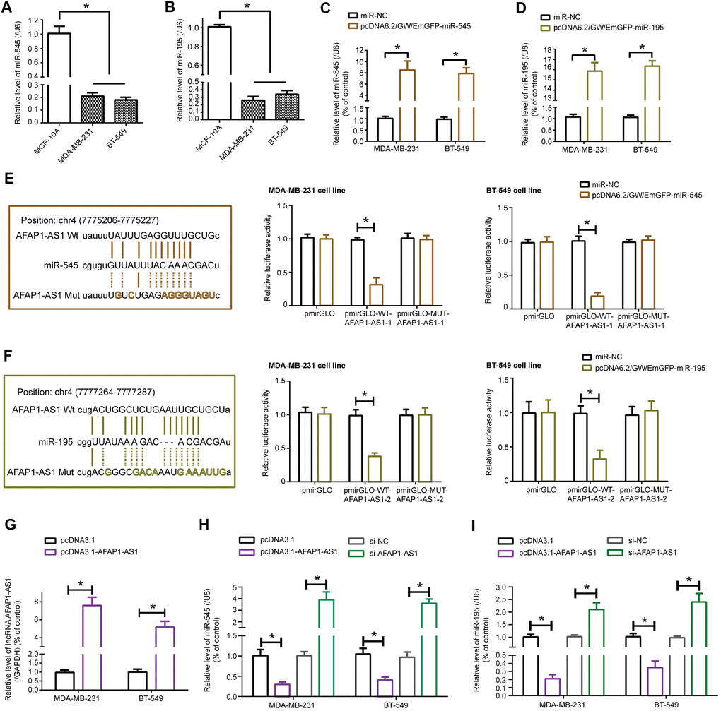 Furthermore, miRNAs were monitored in MDA-MB-231 and BT-549 cell lines transfected by si-lncRNA AFAP1-AS1, and the results insinuated that miR-545-3p and miR-195 were both markedly up-regulated in MDA-MB-231 and BT-549 cell lines of si-lncRNA AFAP1-AS1 group as relative to si-NC group (P<0.05) (Supplementary Figure 4). To emphasize the influence of lncRNA AFAP1-AS1 on miR-545-3p and miR-195, pcDNA3.1-lncRNA AFAP1-AS1 was transfected so as to raise lncRNA AFAP1-AS1 expression in TNBC cell lines (P<0.05) (Figure 2G), through which we discovered that expressions of miR-545 and miR-195 were significantly inhibited in case lncRNA AFAP1-AS1 was over-expressed (P<0.05) (Figure 2H, 2I). Not only that, it was speculated by miRPathDB database (https://mpd.bioinf.uni-sb.de/overview.html) that genes subjected to target of miR-195 and miR-545 were enriched in tumorigenesis-related KEGG pathways (Supplementary Figure 5), further stressing that miR-195 and miR-545 were vital targets of lncRNA AFAP1-AS1 in TNBC.