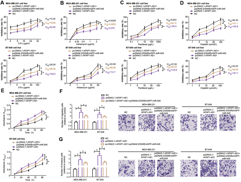 MDA-MB-231 and BT-549 cell lines transfected by pcDNA3.1-lncRNA AFAP1-AS1 demonstrated stronger resistance against 5-Fu (Figure 3A), adriamycin (Figure 3B), paclitaxel (Figure 3C) and cisplatin (Figure 3D) than TNBC cell lines transfected by none (all P<0.05), and pcDNA3.1-lncRNA AFAP1-AS1 combined with pcDNA6.2/GW/EmGFP-miR-545-3p markedly enhanced chemo-resistance of MDA-MB-231 and BT-549 cells in comparison to pcDNA3.1-lncRNA AFAP1-AS1 transfection alone (all P<0.05) (Figures 3A–3D). Moreover, proliferation (Figure 3E), migration (Figure 3F) and invasion (Figure 3G) of MDA-MB-231 and BT-549 cells were reinforced in the pcDNA3.1-lncRNA AFAP1-AS1 group as compared with NC group (all P<0.05), however, these malignant behaviors were undermined in the pcDNA3.1-lncRNA AFAP1-AS1+pcDNA6.2/GW/EmGFP-miR-545 group as opposed to pcDNA3.1-lncRNA AFAP1-AS1 group (all P<0.05) (Figure 3E–3G).