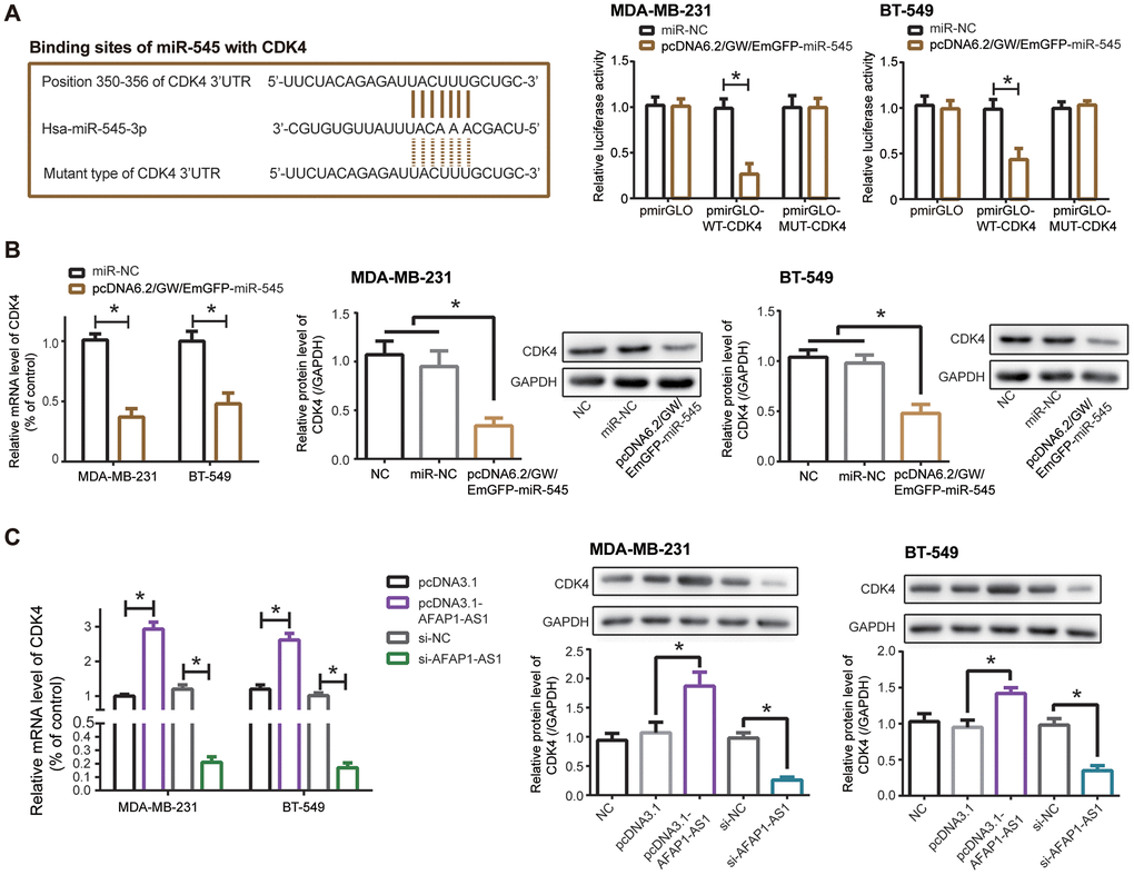 Silencing of lncRNA AFAP1-AS1 also observably reduced mRNA and protein levels of CDK4 in comparison to si-NC group (P<0.05), while mRNA and protein levels of CDK4 were boosted in pcDNA3.1-lncRNA AFAP1-AS1 group as relative to pcDNA3.1 group (P<0.05) (Figure 4C). Together, miR-545/CDK4 axis was critical for lncRNA AFAP1-AS1-involved TNBC pathogenesis.