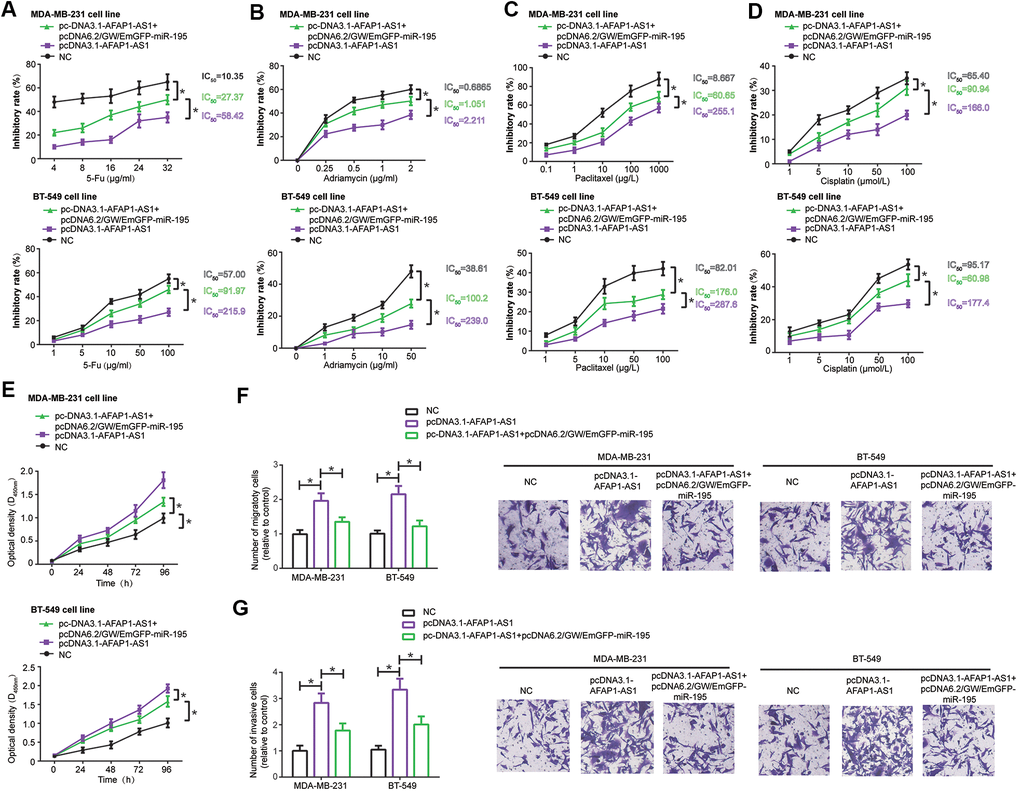 MDA-MB-231 and BT-549 cells in the pcDNA3.1-lncRNA AFAP1-AS1+pcDNA6.2/GW/EmGFP-miR-195 group became less resistant to docetaxel (Figure 5A), adriamycin (Figure 5B), paclitaxel (Figure 5C) and cisplatin (Figure 5D) than TNBC cells in the pcDNA3.1-lncRNA AFAP1-AS1 group (all P<0.05). Likewise, TNBC cells in the pcDNA3.1-lncRNA AFAP1-AS1+pcDNA6.2/GW/EmGFP-miR-195 group were restrained from proliferating (Figure 5E), migrating (Figure 5F) and invading (Figure 5G), as opposed to cells in the pcDNA3.1-lncRNA AFAP1-AS1 group (all P<0.05).