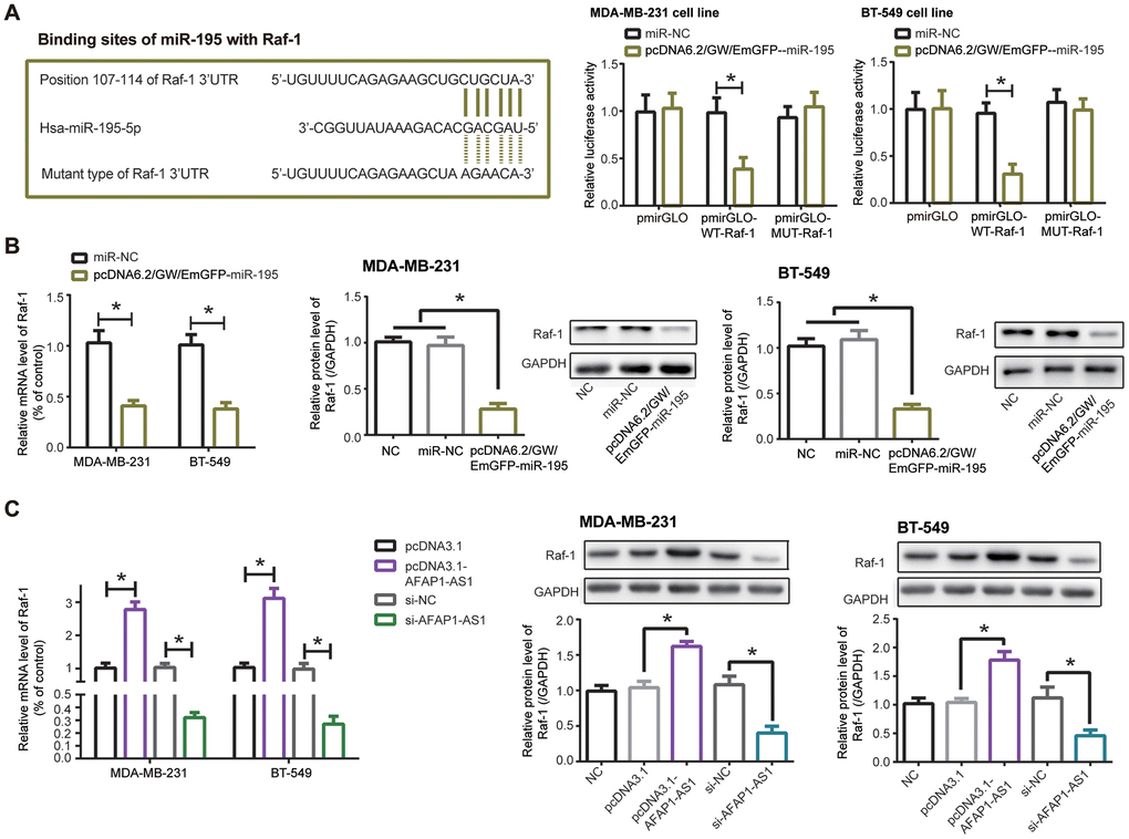 When compared with pmirGLO-MUT-Raf-1+pcDNA6.2/GW/EmGFP-miR-195 group and pmirGLO-MUT-Raf-1+miR-NC group, co-transfection of pmirGLO-WT-Raf-1 and pcDNA6.2/GW/EmGFP-miR-195 engendered a dramatic reduction of luciferase activity in MDA-MB-231 and BT-549 cells (P<0.05), implying that miR-195 targeted Raf-1, a TNBC-specific biomarker [28], in specific sites (Figure 6A). What’s more, mRNA and protein levels of Raf-1 were lowered in MDA-MB-231 and BT-549 cells transfected by pcDNA6.2/GW/EmGFP-miR-195, as compared with NC group and miR-NC group (P<0.05) (Figure 6B). And Raf-1 expression ascended markedly in the pcDNA3.1-lncRNA AFAP1-AS1 group as relative to pcDNA3.1 group (P<0.05), yet declined notably in the si-lncRNA AFAP1-AS1 group in comparison to si-NC group (P<0.05) (Figure 6C). Taken together, miR-195/Raf-1 axis participated in lncRNA AFAP1-AS1-mediated TNBC etiology.