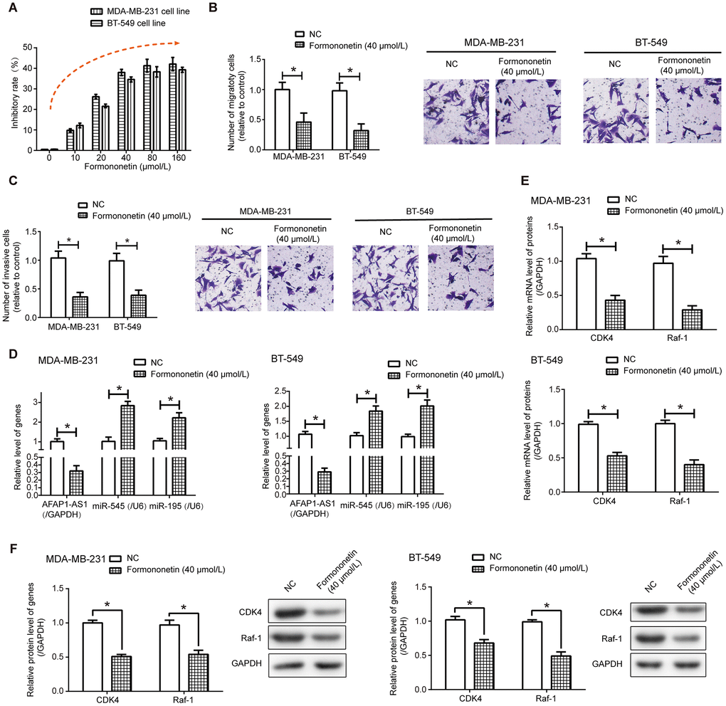 Additionally, lncRNAs that were differentially expressed between MDA-MB-231 cell line and MDA-MB-231/DDP cell line (Supplementary Table 1), as well as lncRNAs documented to involve in TNBC chemo-resistance, including lncRNA H19 [29], Linc00152 [30], lncRNA SPRY4-IT1 [31], lncRNA FTH1P3 [32], linc ROR [33], lncRNA XIST [34], lncRNA CASC2 [35], lncRNA DLX6-AS1 [36] and lncRNA SNHG15 [37], were measured in formononetin-treated MDA-MB-231 and BT-549 cells (Supplementary Figure 6). We noticed that lncRNA AFAP1-AS1 expression in MDA-MB-231 and BT-549 cell lines was prominently decreased under the influence of 40 μmol/L formononetin (P<0.05) (Figure 7D and Supplementary Figure 6). LncRNA AFAP1-AS1-sponged miRNAs, conjectured from ENCORI online database [26], were also detected (Supplementary Figure 7), which revealed that expressions of miR-545-3p and miR-195 were significantly enhanced in formononetin-treated MDA-MB-231 and BT-549 cells as relative to NC group (P<0.05) (Figure 7D). More than that, exposure to 40 μmol/L formononetin gave rise to prominent decreases of CDK4 and Raf-1 at both mRNA (Figure 7E) and protein (Figure 7F) levels, whether in MDA-MB-231 cell line or in BT-549 cell line (P<0.05).