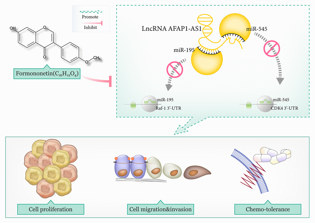 Collectively, formononetin exerted anti-TNBC function by reducing the influence of lncRNA AFAP1-AS1 on miR-545-3p/CDK4 axis and miR-195/Raf-1 axis, which were associated with TNBC exacerbation and chemoresistance (Figure 8). There were, however, a couple of deficiencies in the experimental design. For one thing, although tumor growth in TNBC-bearing mice models, was inhibited by formononetin at the concentration of 80 mg/kg (Supplementary Table 4), along with decreased lncRNA AFAP1-AS1 level and increased miR-545-3p/miR-195 level in the tumor tissues (Supplementary Figure 8), joint effects of formononetin, si-lncRNA AFAP1-AS1 and miR-545-3p/miR-195 mimic on tumor growth in the mice models were not studied. For another, considering that single-target therapy led to smaller objective response rates than multiple-target therapy in terms of treating solid tumors [84, 85], combined application of molecular targets and formononetin might be viable for TNBC treatment, but this point was not clinically supported.