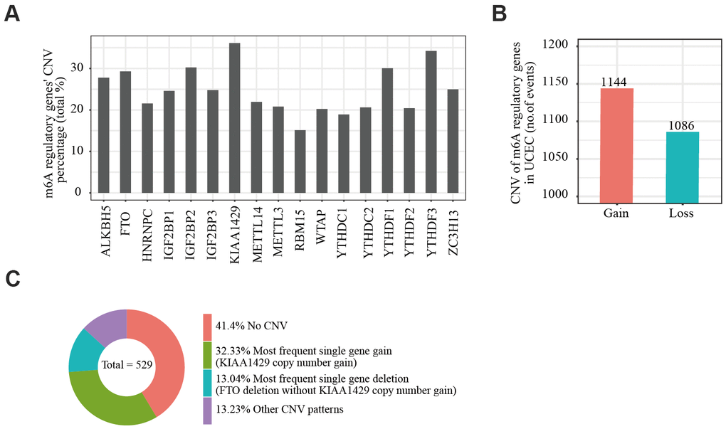 We obtained somatic mutation and CNV data of EC patients from the UCSC Xena database and analyzed changes in m6A regulatory genes. Among the EC samples from 433 cases, mutations in m6A regulatory genes were detected in 133 independent samples (Supplementary Table 4). Of 529 EC samples with CNV data, CNVs were frequently observed in 17 m6A regulator-encoding genes (Figure 1A). Among these, the frequency of CNV was highest in the m6A writer gene KIAA1429 (36.11%, 191/529, Table 1), followed by reader gene YTHDF3 (34.22%, 181/529, Table 1). We then evaluated the CNV pattern in EC samples and found that most CNV events were increases in copy number (1144/1086; Figure 1B). Finally, we determined the most common CNV type in m6A regulatory genes. Copy number gain of KIAA1429 was the most frequent alteration among all m6A regulatory gene CNVs (Figure 1C).