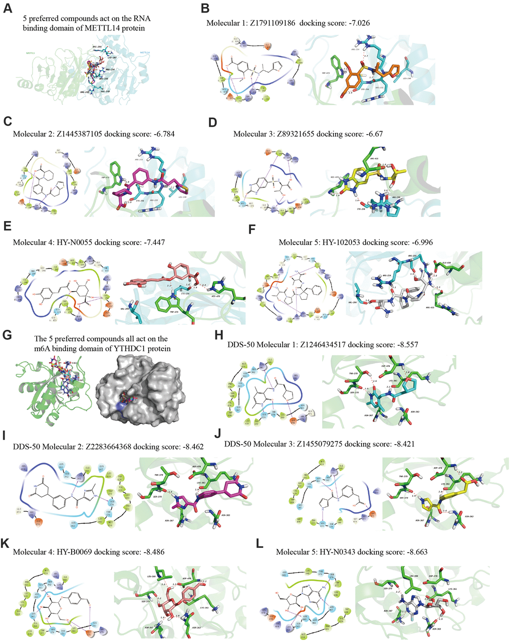Finally, we explored drugs targeting METTL14 and YTHDC1 with potential therapeutic effects via virtual screening. In particular, we analyzed the molecular docking binding force of small-molecule compounds. The RNA-binding domain of METTL14 lies within both METTL3 and METTL14 [22]. We targeted this domain of the human METTL14 protein (key amino acids: R245/R249/R254/R255/K297/R298). Studies have reported the co-crystal structure of human YTHDC1 (PDB ID: 4R3I) and m6A, detailing the conserved m6A-binding region of YTHDC1 and the key amino acid residues (N363/N367/W377/S378) [23], which were used in the present study. From the resulting 2D and 3D model diagrams, we identified the five most relevant compounds (Figure 10).