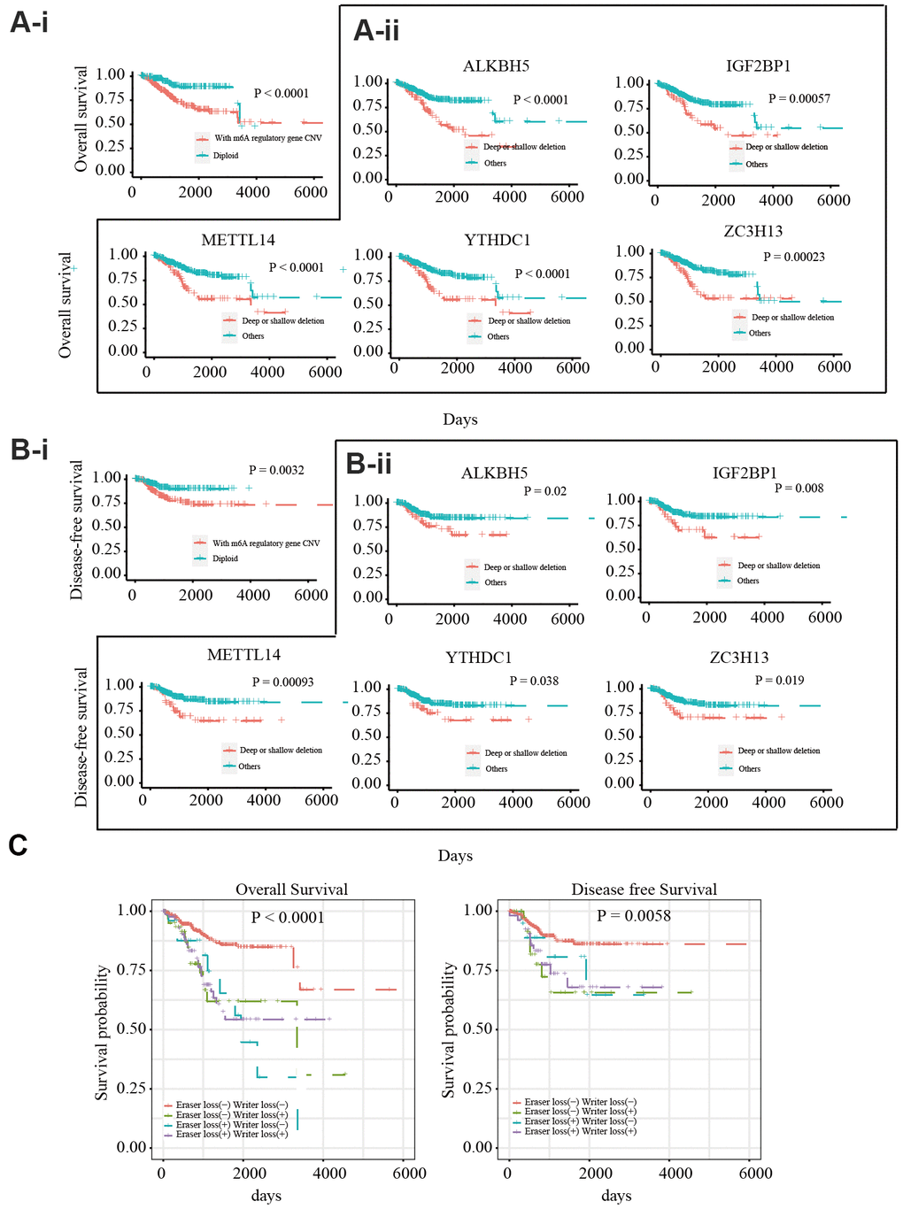 To explore the prognostic value of CNVs in m6A regulatory genes, the effects of CNVs on the overall survival (OS) and disease-free survival (DFS) of 412 patients with EC were analyzed. Different CNV types in m6A regulatory genes were found to be related to OS and DFS (Figure 2A-i, Figure 2B-i). A separate analysis of the 17 genes revealed that patients with deep or shallow deletions of IGF2BP1, ZC3H13, METTL14, ALKBH5, or YTHDC1 had lower OS and DFS than those who did not (Figure 2A-ii, Figure 2B-ii; and Supplementary Figures 2, 3). Univariate Cox analysis indicated that age, stage, grade, invasion, and lymph metastasis were independent risk factors for OS. The somatic mutation of POLE, PTEN, PIK3CA, KRAS, PIK3R1, TP53, FBXW7, and PPP2R1A genes were not significantly correlated with the survival rate of patients. Further, loss of eraser and writer genes was found to be an independent risk factor for DFS and OS (Table 3). Patients in the eraser loss (+) + and writer loss (+) groups had the shortest OS and DFS (Figure 2C). These results supported a relationship between decreased m6A regulator levels and poor survival.