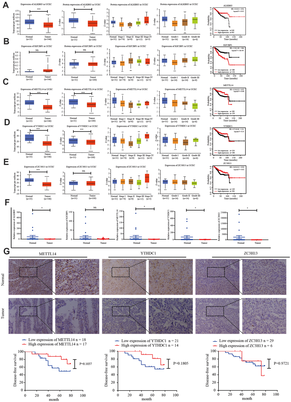 TCGA data was used to analyze the expression of IGF2BP1, ZC3H13, METTL14, ALKBH5, and YTHDC1 mRNA in 35 normal and 546 EC tissues. The UALCAN online tool (http://ualcan.path.uab.edu/index.html) was employed to assess corresponding protein expression in 31 normal and 100 EC tissues. ZC3H13, METTL14, ALKBH5, YTHDC1, and IGF2BP1 expression were downregulated. We performed univariate survival analysis of the EC TCGA data to determine the relationship between the expression of these five genes and EC prognosis. High expression of IGF2BP1 was associated with unfavorable prognosis, while high expression of ZC3H13, METTL14, and ALKBH5 was associated with improved prognosis (Figure 3A–3E).
