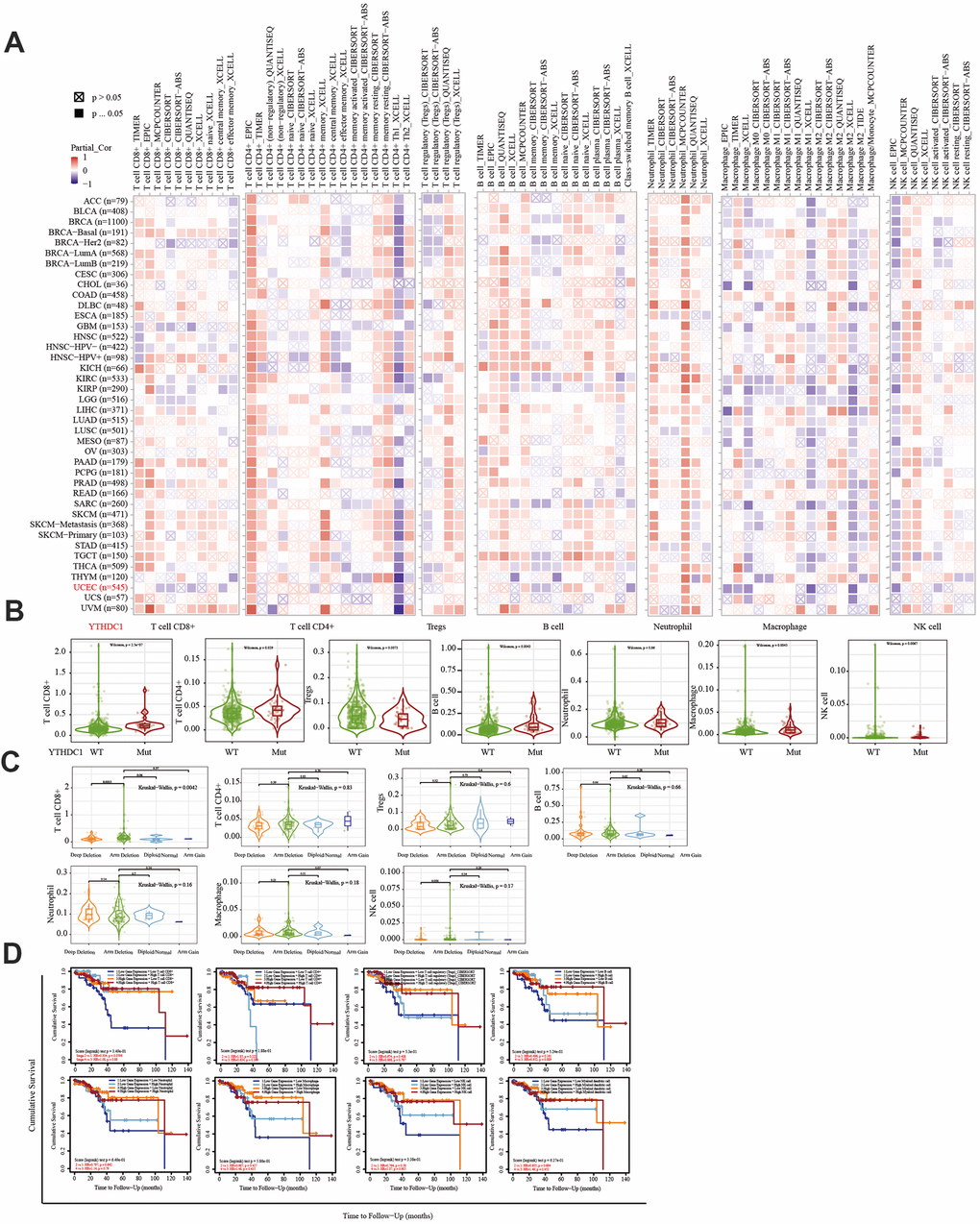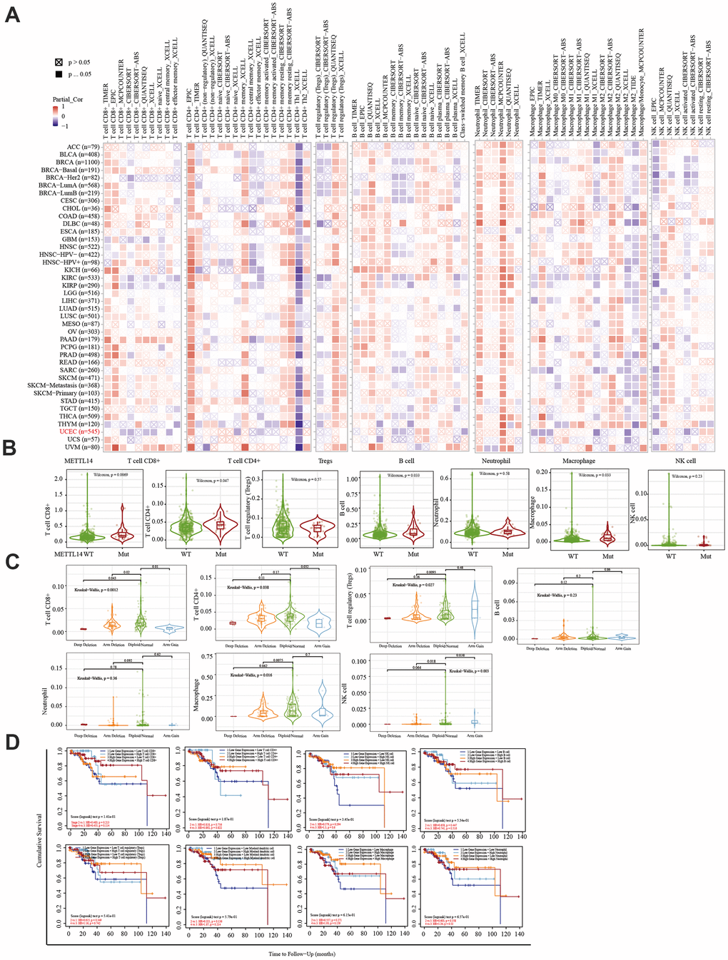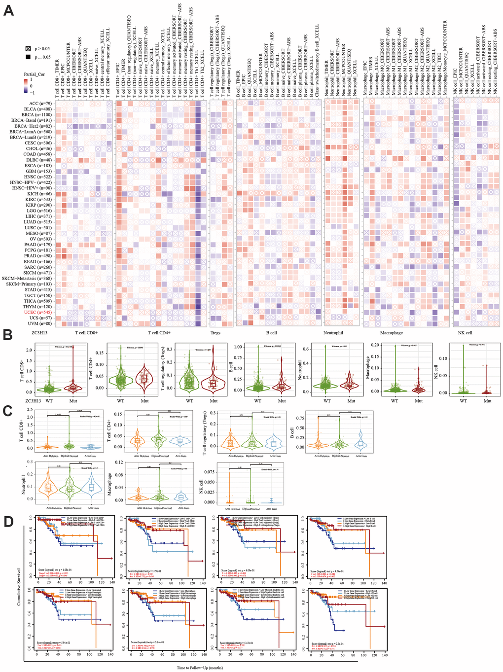 The immune system facilitates anti-tumor immune surveillance. Innate immune cells include NK cells, eosinophils, basophils, and phagocytes, which directly kill tumor cells or trigger the activation of adaptative immunity. The adaptive immune system functions through the activation and differentiation of lymphocytes (including B cells and T cells). B cells play a major role in humoral immune responses, while T cells drive cell-mediated immunity [29]. TIMER database analysis indicated that METTL14 was positively correlated with CD4+ T cell infiltration and negatively correlated with macrophage infiltration. ZC3H13 and YTHDC1 were also positively correlated with CD4+ T cell infiltration while being negatively correlated with macrophage and NK cell infiltration. METTL14, ZC3H13, and YTHDC1 mutations were frequently detected in EC. METTL14 mutations were associated with CD8+ T cell, CD4+, T cell, and B cell infiltration. ZC3H13 mutations were associated with CD8+ T cell, CD4+ T cell, B cell, neutrophil, macrophage, and NK cell infiltration. Mutations of YTHDC1 were associated with CD8+ T cell, CD4+ T cell, Treg, B cell, macrophage, and NK cell infiltration. Taken together, TIMER analysis indicated that METTL14, ZC3H13, and YTHDC1, as key regulators of m6A modifications, were closely related to tumor immune infiltration in EC.