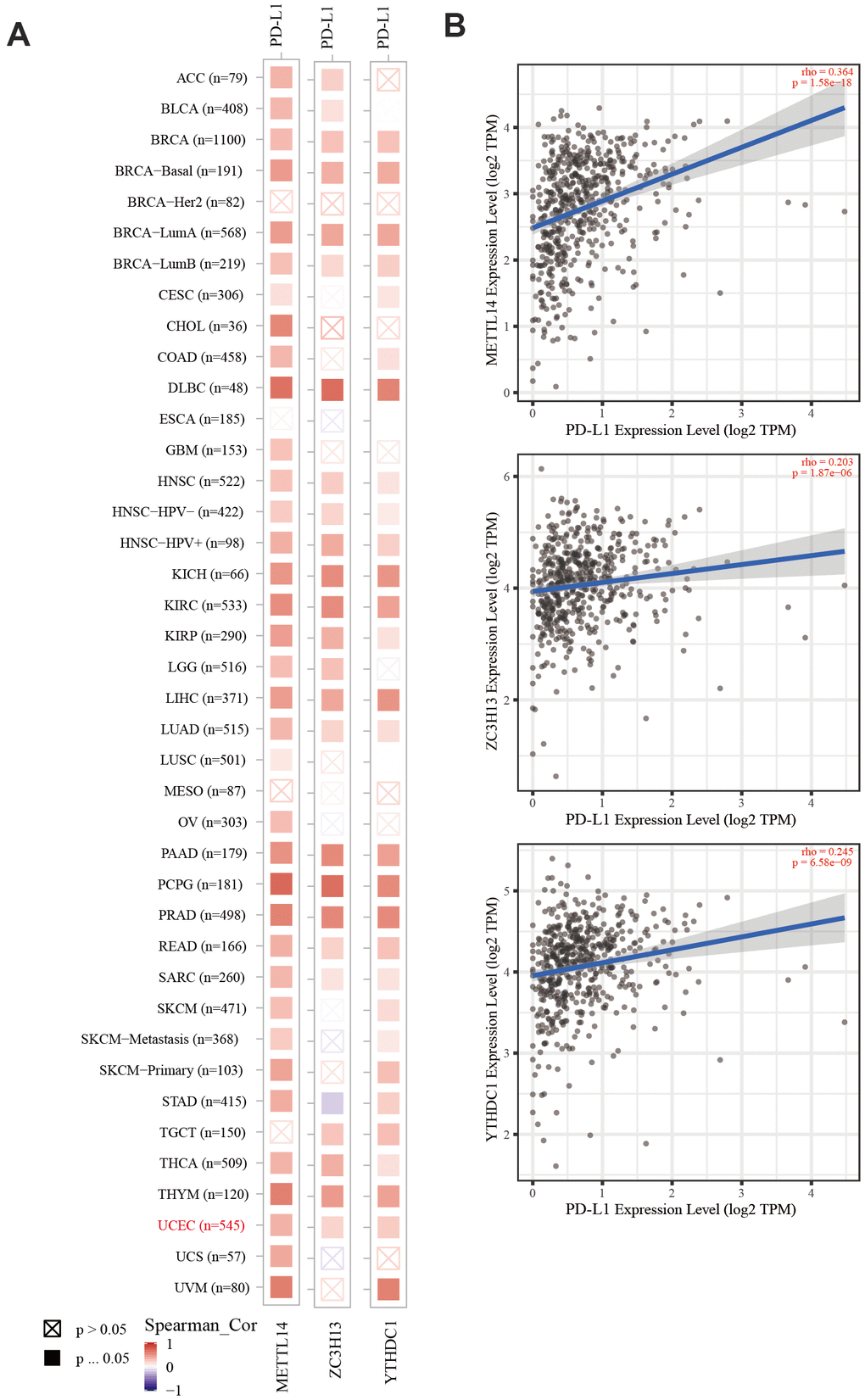 Cancer cells have evolved a variety of mechanisms for immune evasion, including defective antigen presentation, upregulation of immune checkpoint molecules, and the recruitment of immunosuppressive cell populations, all of which contribute to the failure of anti-tumor immune responses [30]. As a key immune checkpoint, PD-L1 inhibits anti-tumor immunity by interacting with its receptor, programmed cell death protein-1 (PD-1) on the membrane of immune cells. Blocking the PD-L1/PD-1 interaction can significantly enhance the anti-tumor immune response and represents a major breakthrough in cancer treatment [31]. In recent years, data from clinical studies on immune checkpoint inhibition in EC have demonstrated the efficacy of PD-1 inhibitors in a subgroup of advanced PD-L1-positive endometrial cancer patients who failed previous multi-line treatments [32]. However, studies have shown that immunotherapy-resistant colorectal cancer (CRC) tumors have a low mutation burden with proficient mismatch repair or low microsatellite instability (pMMR-MSI-L). The inhibition of METTL3 and METTL14 via methyltransferase inhibitors suppressed N-methyladenosine (mA) mRNA modification and enhanced the response to anti-PD-1 therapy in pMMR-MSI-L CRC and melanoma, highlighting the relevance of RNA methylation in adaptive immunity [33]. Our analysis revealed that the expression of METTL14, ZC3H13, and YTHDC1 was positively correlated with PD-L1 expression in EC, suggesting that these proteins can improve the immunotherapy outcome.