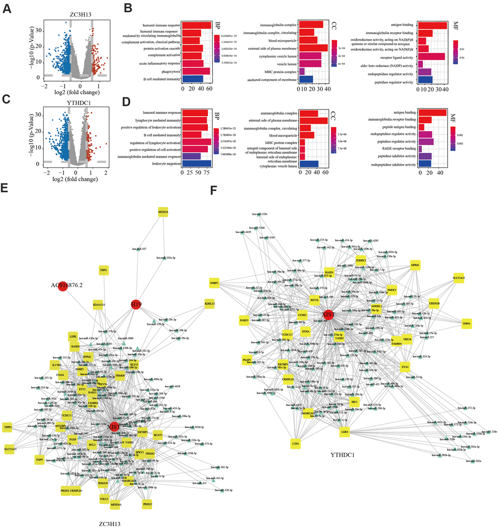 In view of ZC3H13 and YTHDC1 suppression promoting proliferation and invasion, we sought to further explore the underlying molecular mechanisms of both in EC. To this end, we downloaded lncRNA and miRNA data of 529 EC samples and 35 normal samples from the TCGA and cBioPortal for Cancer Genomics databases. A total of 846 differentially expressed genes were identified for ZC3H13, including 146 upregulated and 700 downregulated genes, in addition to 55 differentially expressed non-coding transcripts, 8 of which were upregulated and 47 downregulated. A total of 1107 differentially expressed genes were identified for YTHDC1, comprising 177 upregulated genes and 930 downregulated genes. In addition, 66 differentially expressed non-coding transcripts were identified, including 5 upregulated and 61 downregulated molecules. The bar plot depicts significantly enriched GO terms in patients with low ZC3H13 and YTHDC1 expression. Functional enrichment analyses revealed significantly enriched terms, including the humoral immune response and B cell-mediated immunity (Figure 9A–9D). We constructed a competing endogenous RNA (ceRNA) regulatory network to explain the potential regulatory mechanism of low ZC3H13 and YTHDC1 expression in EC. The ceRNA network related to ZC3H13 expression included 3 lncRNAs, 124 miRNAs, and 35 mRNAs, while that related to YTHDC1 expression included 1 lncRNA, 121 miRNAs, and 125 mRNAs (Figure 9E, 9F). There were 1301 differentially expressed genes associated with METTL14, including 186 upregulated genes and 1115 downregulated genes, in addition to 143 differentially expressed non-coding transcripts, of which 5 were upregulated and 138 were downregulated (Supplementary Figure 7A). Functional enrichment results of low METTL14 expression in EC revealed several immune-related GO terms (Supplementary Figure 7B). The ceRNA regulatory network related to METTL14 expression included 3 lncRNAs, 12 miRNAs, and 8 mRNAs (Supplementary Figure 7C).