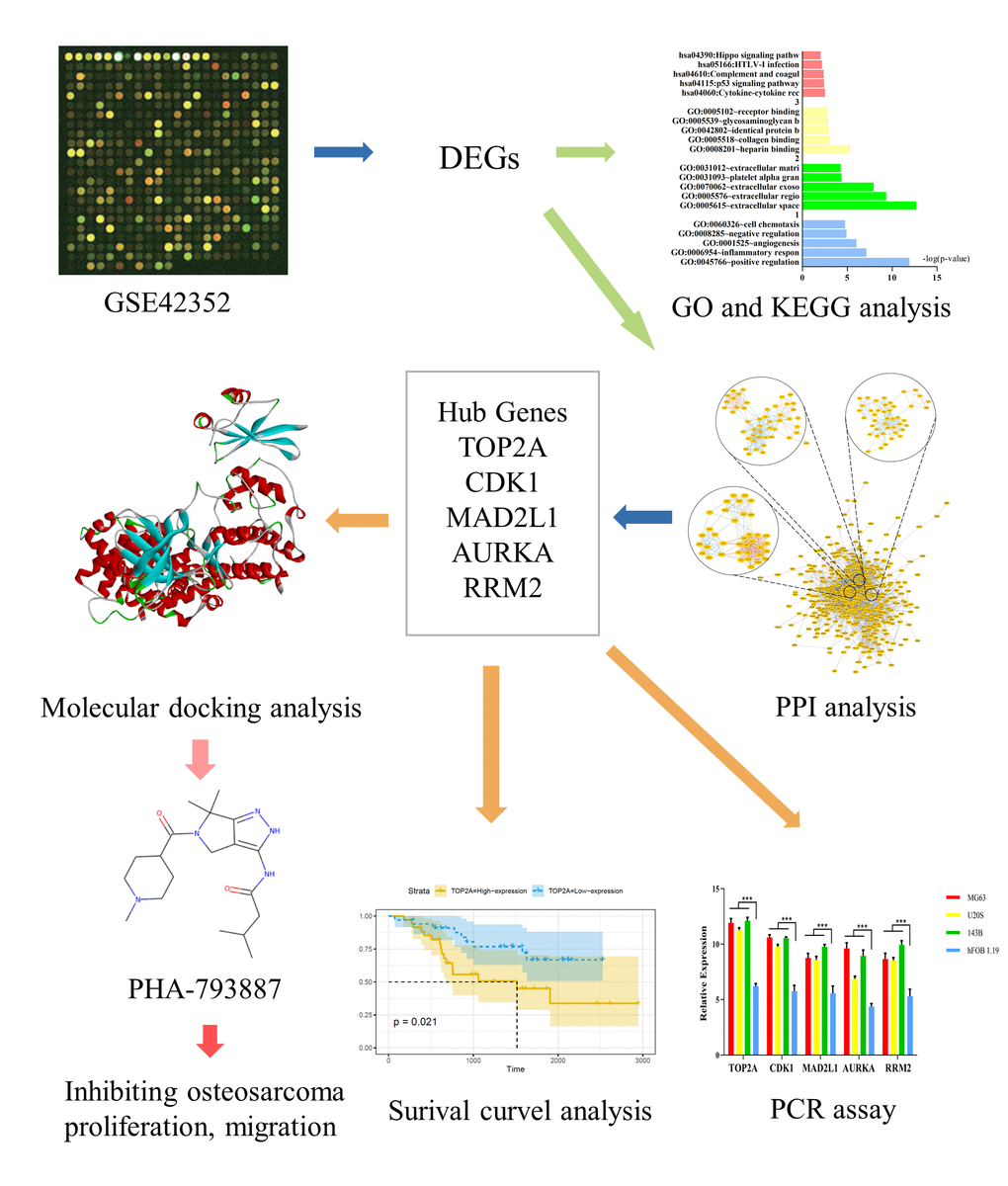 In conclusion, we identified 543 DEGs between osteosarcoma and normal tissues in this study. GO and KEGG analyses revealed that these genes were mainly involved in the positive regulation of the cell cycle, DNA repair, cytokinesis, angiogenesis, inflammatory responses and cytokine-cytokine receptor interactions. Angiogenesis could be regarded as a treatment target in osteosarcoma. TOP2A, CDK1, MAD2L1, AURKA and RRM2 were screened as hub genes in the PPI network, and patients with lower TOP2A and CDK1 levels had better prognoses. PHA-793887 dose-dependently inhibited CDK1 expression and induced apoptosis in osteosarcoma cells, thus reducing their proliferation and invasion. Therefore, PHA-793887 is a promising potential drug for osteosarcoma patients.