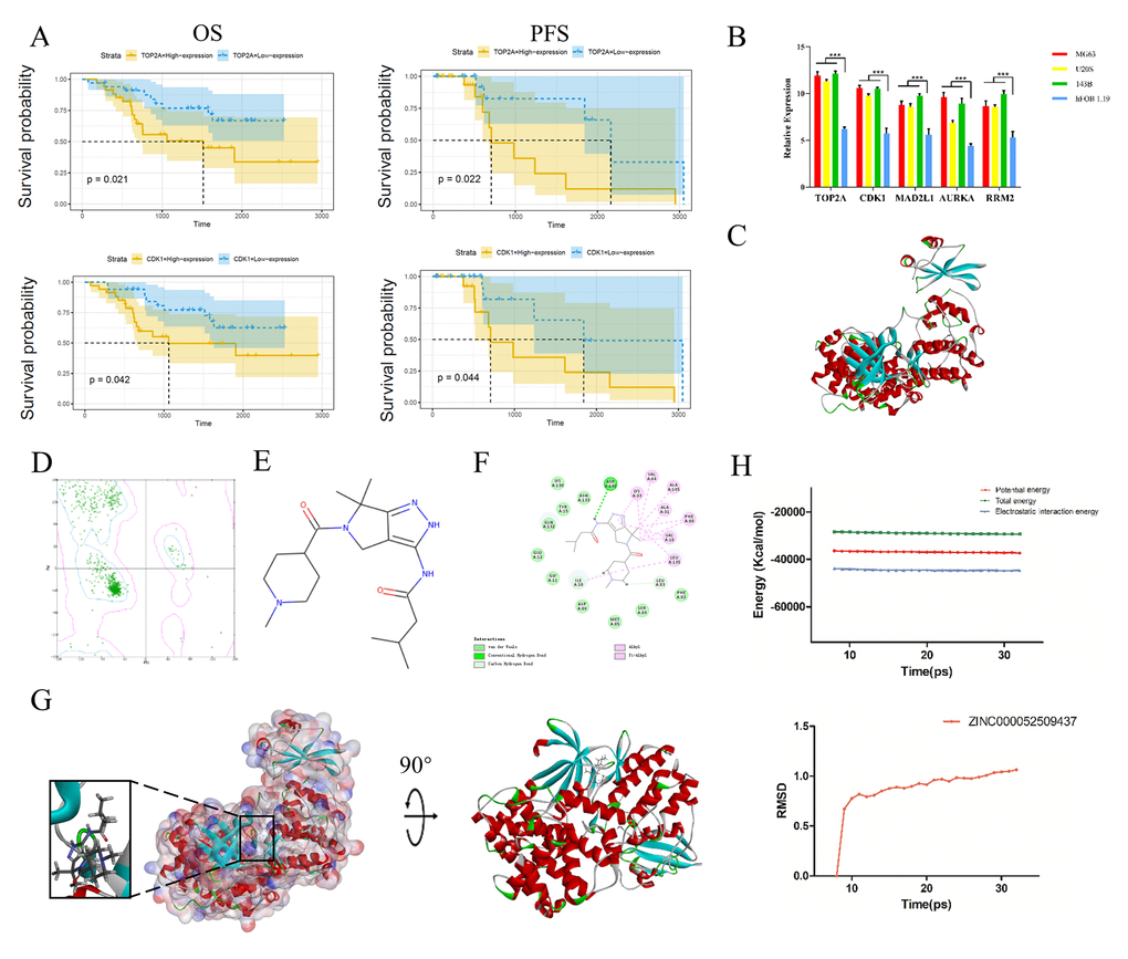 We then conducted a molecular dynamics simulation to evaluate the stability of the PHA-793887/CDK1 complex under dynamic conditions. The initial conformations were obtained from the CDOCKER molecular docking experiment. The root-mean-square deviation curves and potential energy of the PHA-793887/CDK1 complex revealed that the complex trajectory reached equilibrium after 20 ps, and the potential energy of the complex stabilized over time (Figure 4H). Thus, the molecular dynamics simulation indicated that PHA-793887 binds steadily to CDK1.