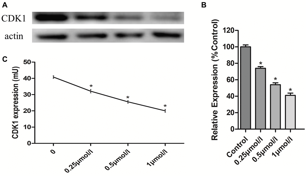 To verify that the effects of PHA-793887 were due to its inhibition of CDK1 in osteosarcoma cells, we assessed CDK1 levels using Western blotting and an enzyme-linked immunosorbent assay (ELISA). Western blotting demonstrated that CDK1 expression decreased with increasing drug concentrations (Figure 6A, 6B). The same tendency was observed in the ELISA results (Figure 6C). These findings suggested that PHA-793887 induces apoptosis in osteosarcoma cells by inhibiting CDK1.