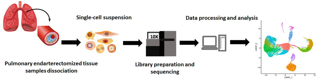 The occurrence and development of CTEPH are complex processes involving various genes, multiple cell types, and a large number of signal transduction systems [8]. In particular, the roles of multiple cell types in disease development are gaining increasing attention. It has been reported that accumulation of circulating inflammatory cells [9] and excessive proliferation and migration of smooth muscle and endothelial cells [10–12] are involved in pulmonary arterial remodeling during CTEPH. Moreover, crosstalk between endothelial-like and myofibroblast-like cells has been shown to play a key role in endothelial cell dysfunction, contributing to vascular lesion in CTEPH [13]. Despite these findings, the cell types contributing to CTEPH progression have not been fully elucidated. A clear and complete atlas of the cellular repertoire that participates in the occurrence and development of CTEPH is vital for the development of effective diagnostic and therapeutic strategies to prevent CTEPH and decrease mortality.