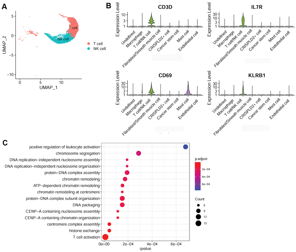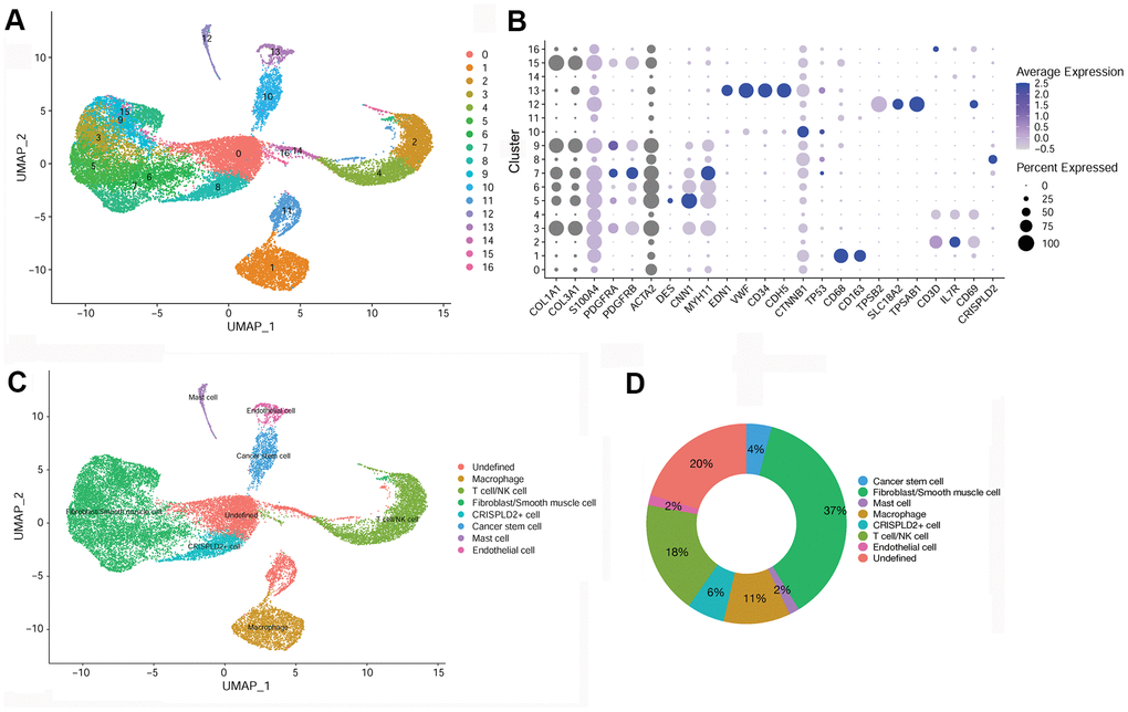 After quality filtering and normalization of gene expression, dimension reduction involving the top 20 components was conducted. As a result, a total of 17 cell clusters (clusters 0–16) was characterized (Figure 2A), corresponding to 10,518 marker genes. We then determined marker genes that were uniquely expressed in each cell cluster in comparison with all other clusters. The key marker genes for each cell cluster are presented in Figure 2B. Based on cell markers, fibroblast/smooth muscle cells were composed of clusters 3, 5, 6, 7, 9, and 15, and accounted for the largest proportion (37%) of total cells. Clusters 2 and 4 were classified as T-/NK cells, with a relative percentage of 18%. Clusters 1, 8, 10, 12, and 13 were classified as macrophages (11%), CRISPLD2+ cells (6%), cancer stem cells (4%), mast cells (2%), and endothelial cells (2%), respectively. Clusters 0, 11, 14, 16 were categorized as ‘undefined’ (20%) (Figure 2C, 2D).