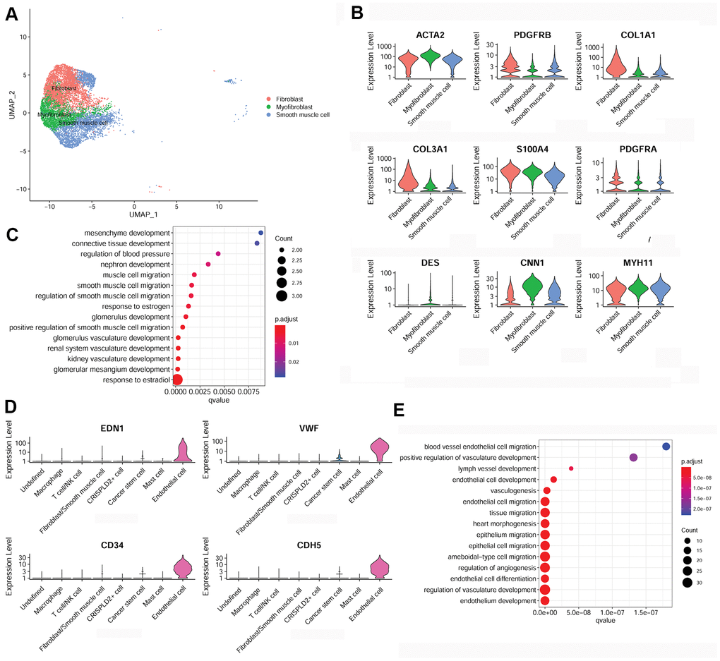 In addition, specific marker genes of endothelial cells were determined to be endothelin 1 (END1), von Willebrand factor (VWF), CD34, and cadherin 5 (CDH5) (Figure 3D). These were mainly enriched for functions associated with cell migration, such as endothelial cell migration, epithelium migration, and ameboid-type cell migration (Figure 3E).