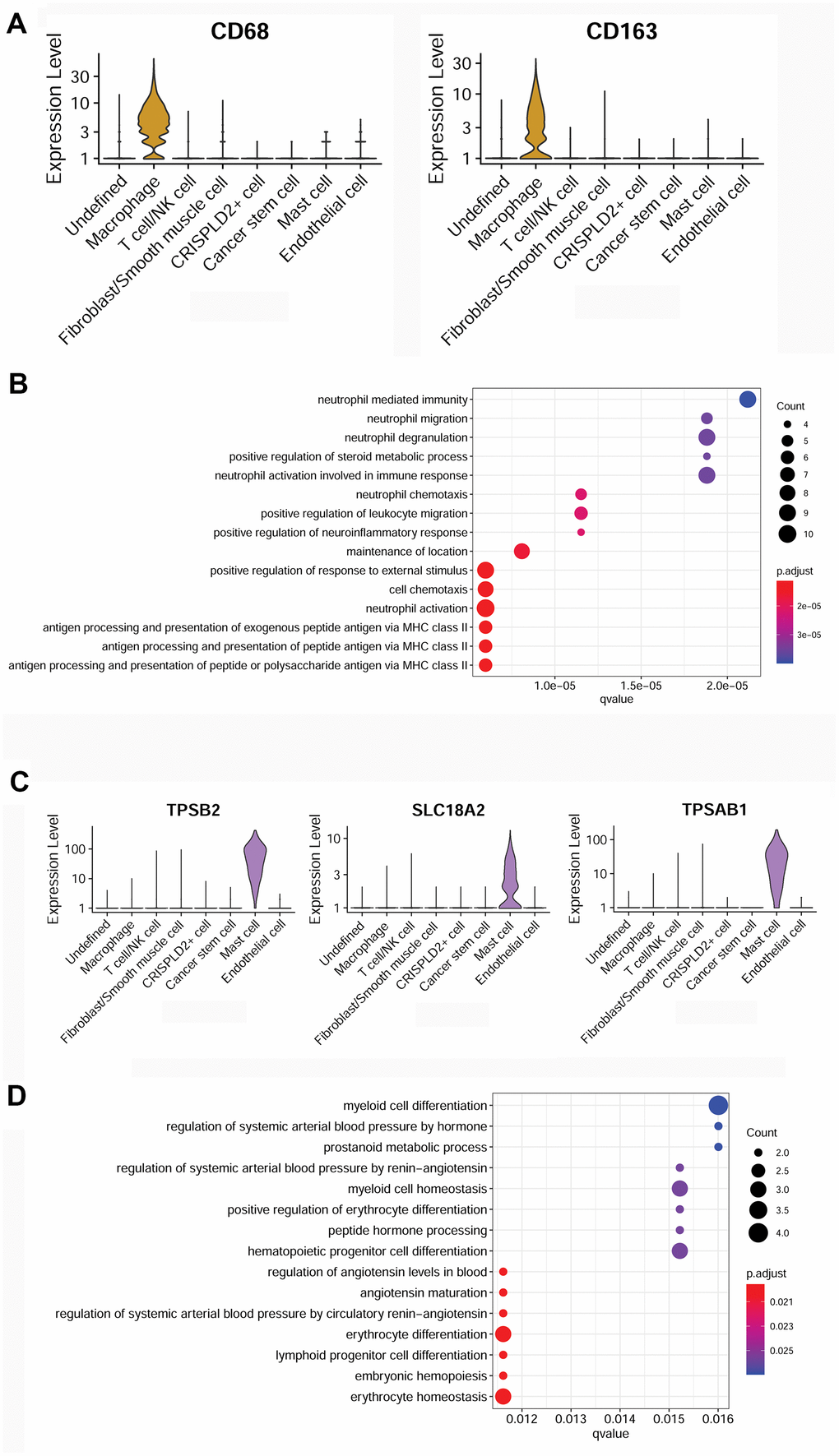 To better understand the immune mechanisms underlying CTEPH, we further characterized T-/NK cells, macrophages, and mast cells in pulmonary endarterectomized tissues of CTEPH patients. The T-/NK cell cluster was also subdivided into T- and NK cells, as shown in the UMAP plot (Figure 4A). Figure 4B shows violin plots of the specific marker genes of the T-/NK cell cluster, including CD3D, interleukin 7 receptor (IL7R), CD69, and killer cell lectin-like receptor B1 (KLRB1). Further Gene Ontology (GO) enrichment analysis showed that T cell activation was an important function significantly enriched in the marker genes identified in T-/NK cells (Figure 4C). Specific macrophage marker genes were identified as CD68 and CD163 (Figure 5A), which were significantly involved in key functions in neutrophil activation, cell chemotaxis, and antigen processing and presentation via MHC Class II molecules (Figure 5B). In addition, the specific marker genes of mast cells were revealed to be tryptase beta 2 (TPSB2), solute carrier family 18 member A2 (SLC18A2), and tryptase alpha/beta 1 (TPSAB1) (Figure 5C). The significantly enriched GO functions of these mast cell marker genes included erythrocyte differentiation and homeostasis (Figure 5D).