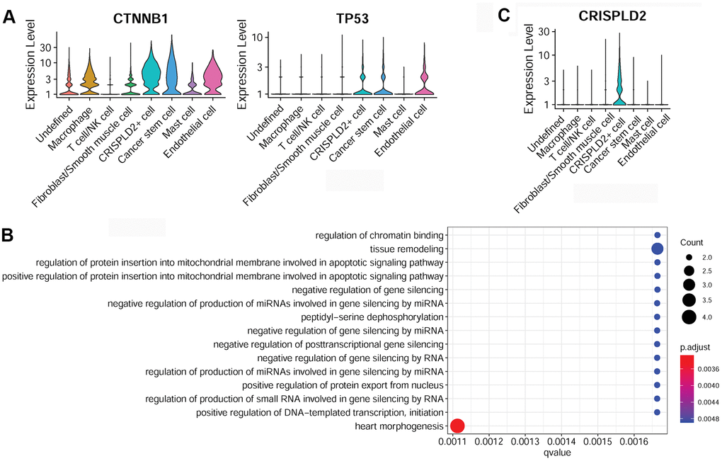 Specific marker genes of cancer stem cells were determined to be catenin beta 1 (CTNNB1) and tumor protein P53 (TP53) (Figure 6A). The over-represented GO function in cancer stem cell marker genes was categorized as ‘tissue remodeling’ (Figure 6B). The specific marker gene of CRISPLD2+ cells was identified as CRISPLD2 (Figure 6C). However, no significant GO function was enriched for this gene.