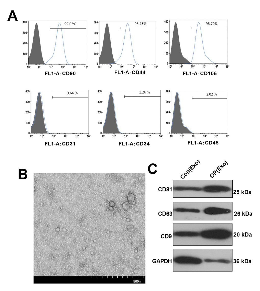 Flow cytometry analysis with cell surface specific markers was used to identify BMSCs (Figure 1A). It was found that CD90, CD44 and CD105 were positive, while CD31, CD34 and CD45 were negative in BMSCs. BMSCs-derived exosomes were isolated through centrifugation (Figure 1B), and the purified exosomes were observed by TEM. Western blot confirmed that BMSCs-derived exosomes expressed and enriched with known exosome markers CD9, CD63 and CD81 (Figure 1C).