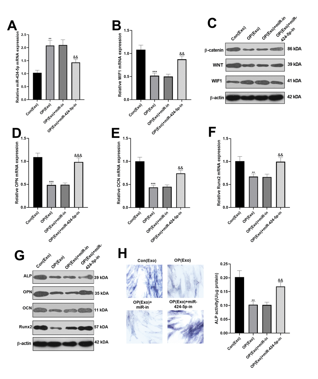 BMSCs-derived exosomes with miR-424-5p inhibitors were obtained, and then co-cultured with osteogenic BMSCs for 7 days. Then, the miR-424-5p and WIF1 expression were examined by qRT-PCR. As a result, compared with the OP(Exo)+ miR-NC group, miR-424-5p was knocked down and WIF1 was overexpressed after transfection with miR-424-5p inhibitors (Figure 3A, 3B). Meanwhile, western blot was performed to test the WIF1/Wnt/β-catenin expression, and it was found that compared with the OP(Exo)+ miR-NC group, WIF1 was overexpressed, while Wnt and β-catenin were knocked down after transfection of miR-424-5p inhibitors (Figure 3C). Subsequently, the mRNA expression of OPN, OCN, and Runx2 in BMSCs were compared by qRT-PCR, and the results illustrated that their levels were notably higher than those of the OP(Exo)+miR-NC group after transfection of miR-424-5p inhibitors (Figure 3D–3F). Also, western blot demonstrated the protein expression changes of OPN, OCN, and Runx2 were similar with that in mRNA (Figure 3G). Furthermore, ALP staining proved that compared with OP(Exo)+miR-NC group, the BMSCs transfected with miR-424-5p inhibitors had more blue cytoplasmic granules, accompanied by ALP elevation (Figure 3H), suggesting that dampening miR-424-5p expression in exosomes enhanced osteogenic differentiation of BMSCs.